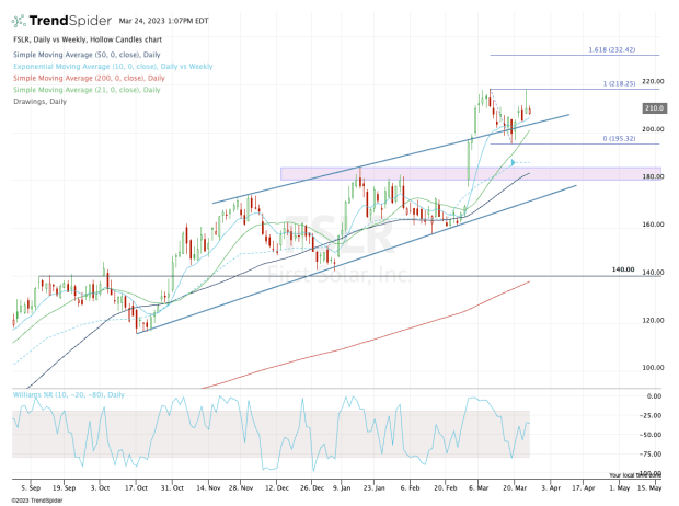 If the market can find its footing and rally from here, we could be looking at another push back up to these highs. A breakout over the $218 to $220 area could open significant upside in First Solar stock.