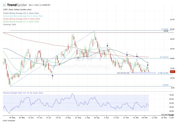 The problem? Since topping out near $20 resistance in September, ChargePoint stock has been making a series of lower highs, which is bearish price action.