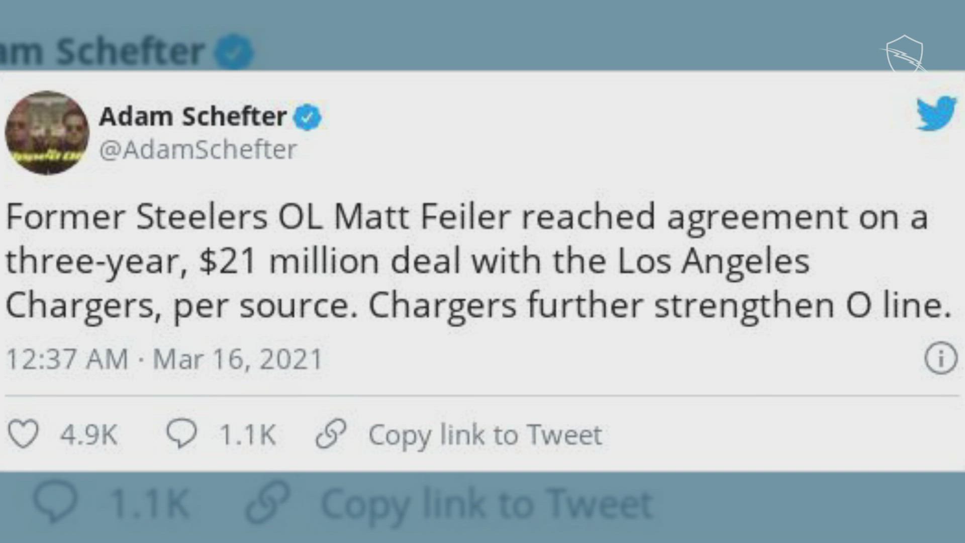 Former Steelers OL Matt Feiler reached agreement on a three-year, $21 million deal with the Los Angeles Chargers, per source. Chargers further strengthen O line.