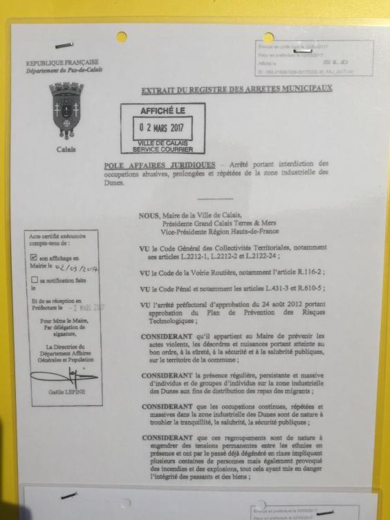 It proceeds to state that the distributions are important because they help “ensure the safety of Calais residents and traders” and provide “an opportunity to identify medical problems, especially for minors who are victims of the cold”, as well as making it possible for refugees to receive legal advice.