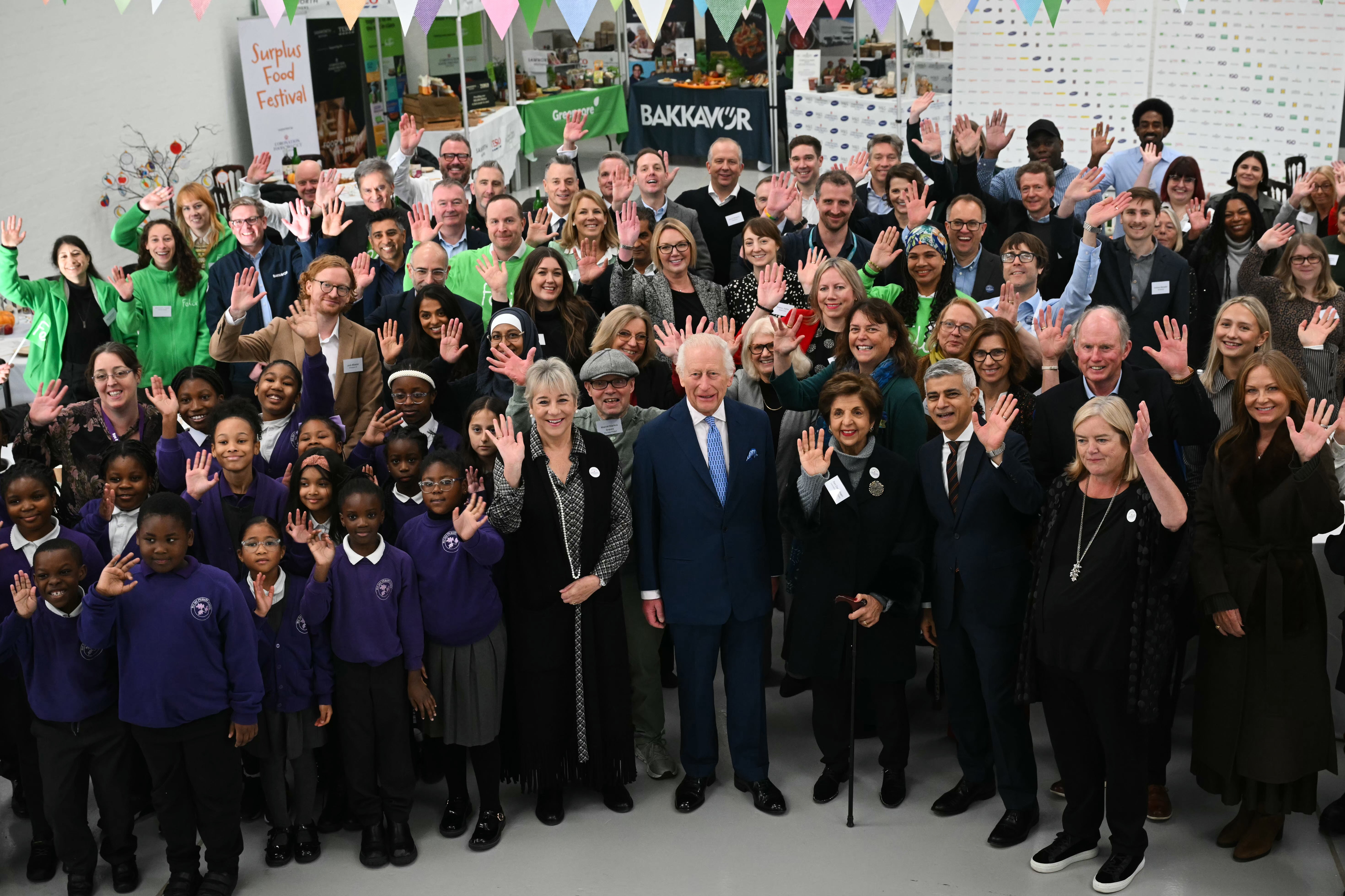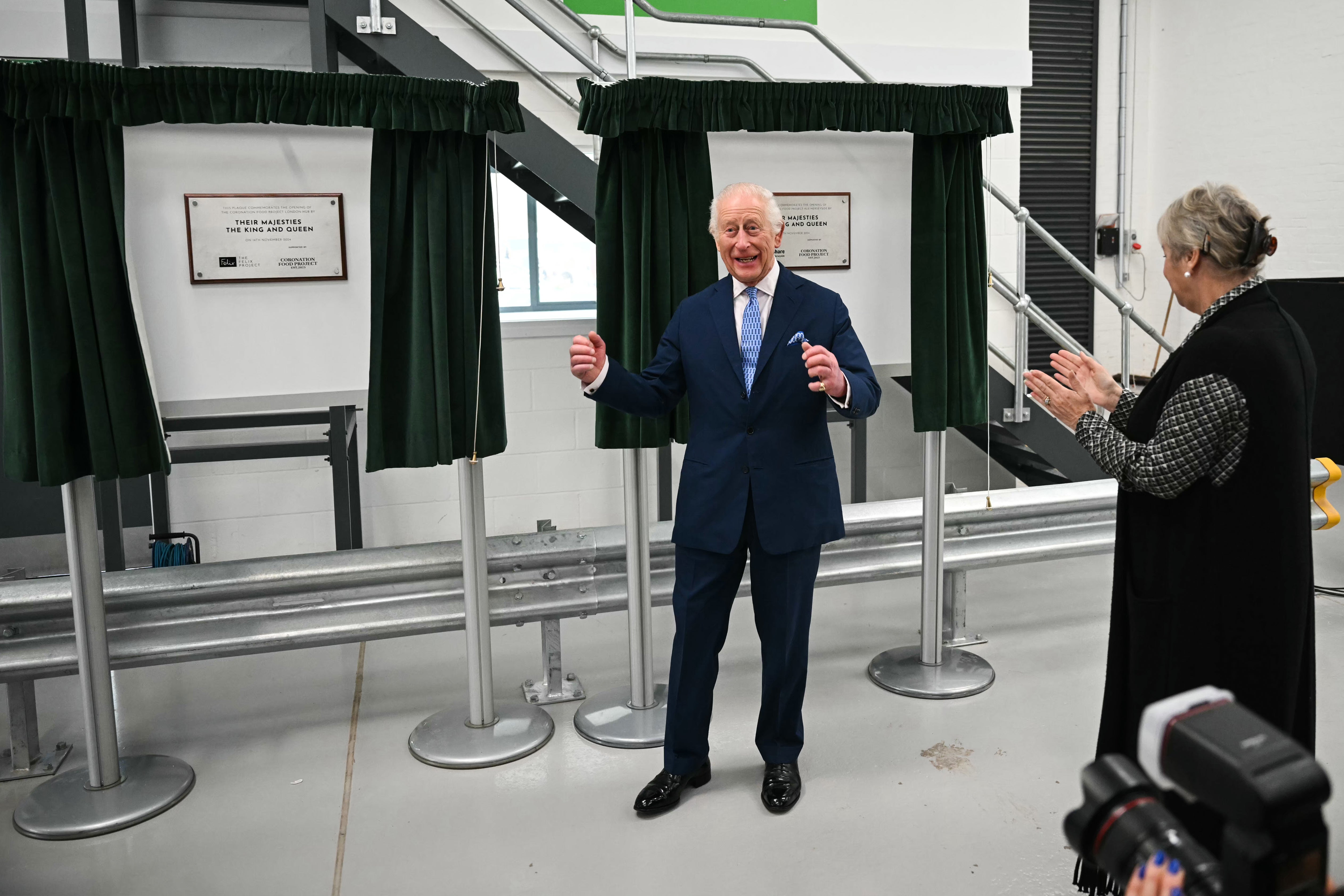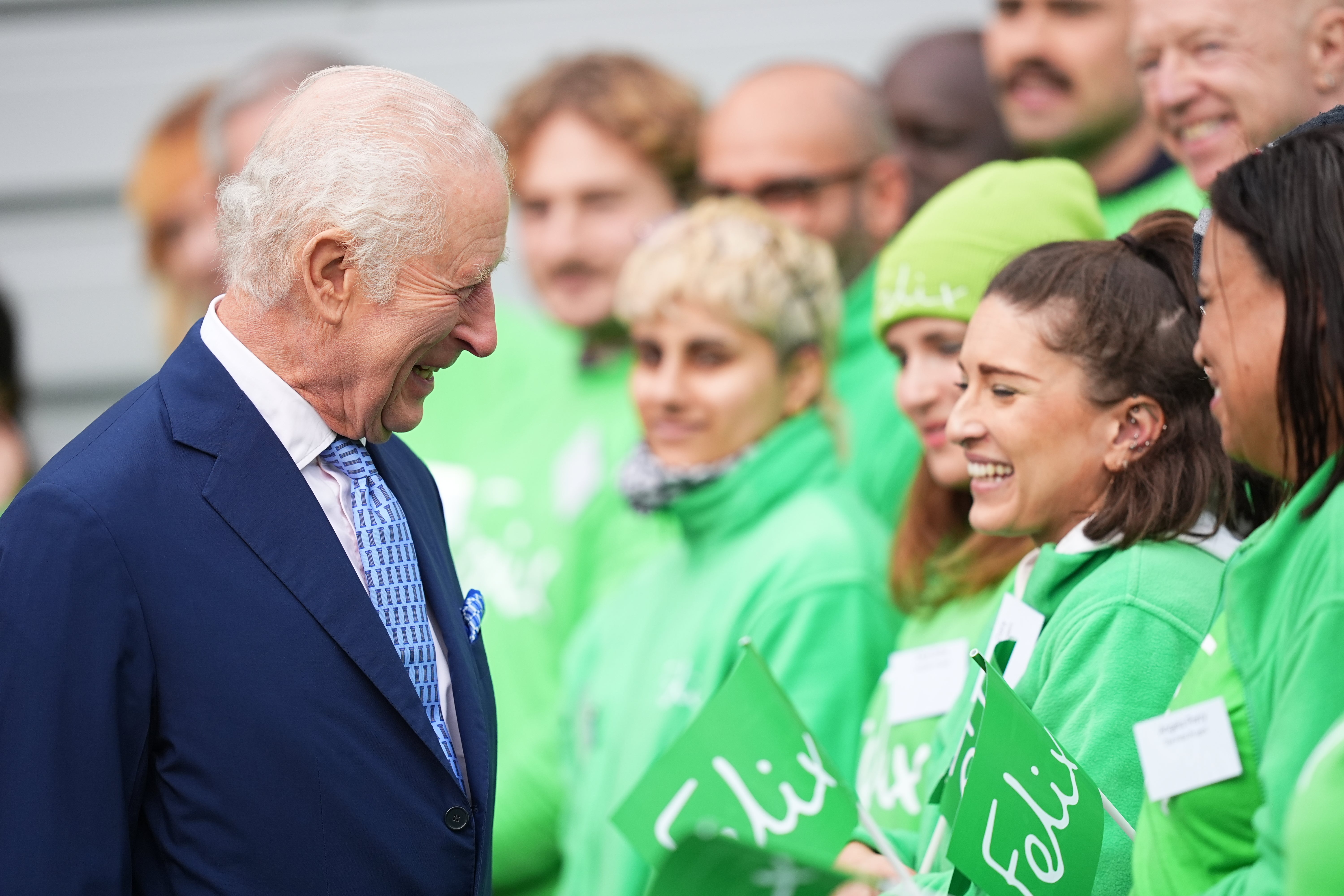 Volunteers from the Felix Project, who were dressed in the charity’s signature green and who will run the London hub, clapped, cheered and waved flags as Charles stepped from his Bentley.