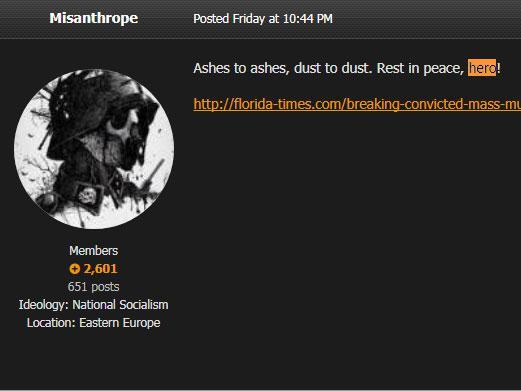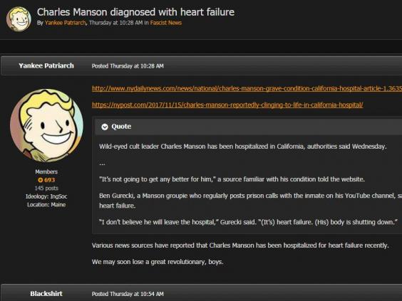 Others have also paid tribute to Manson on the ironmarch website, which is billed as a “global fascist fraternity” and carries the slogan “Gas the k***s, race war now”.