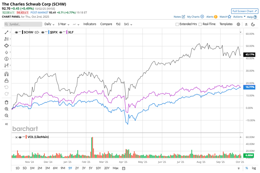 The Charles Schwab Corporation (SCHW), headquartered in Westlake, Texas, operates as a savings and loan holding company. With a market cap of $167.5 billion, the company provides wealth and asset management, securities brokerage, banking, trading and research, custody, and financial advisory services. The leading financial services firm is expected to announce its fiscal third-quarter earnings for 2025 before the market opens on Thursday, Oct. 16.