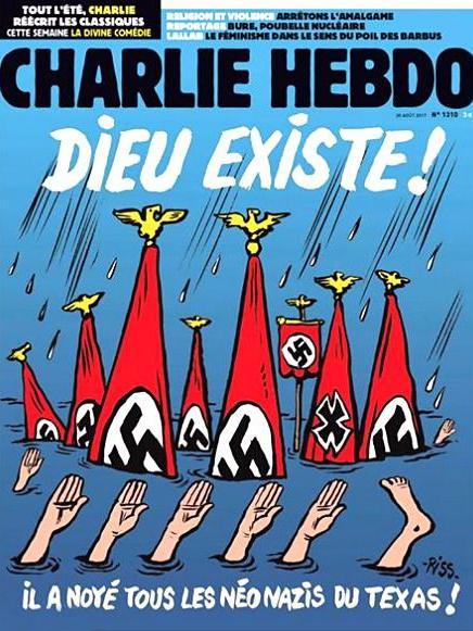 The art on the Charlie Hebdo cover shows swastika flags and hands raised in what looks like Nazi salutes poking out above floodwaters. The text reads: "God exists! He drowned all the neo-Nazis of Texas." The illustration is an apparent reference to Texans' support of Donald Trump, who won 52.6 percent of the state's vote in the presidential election.