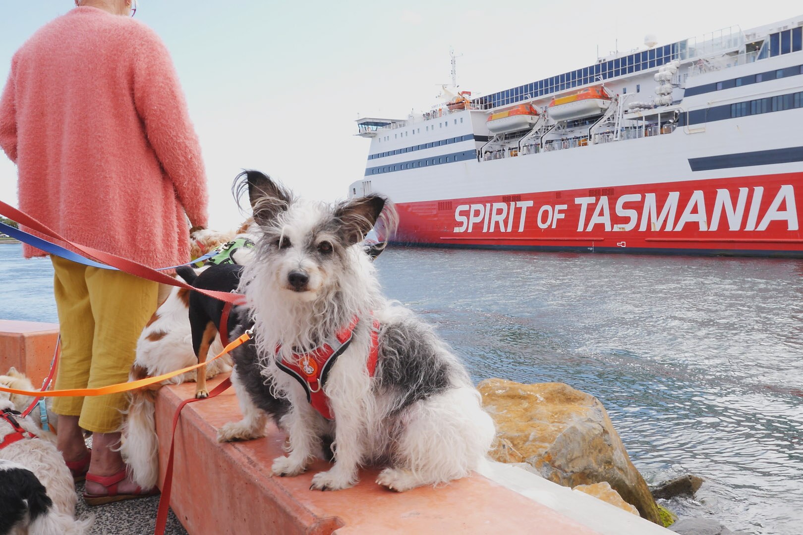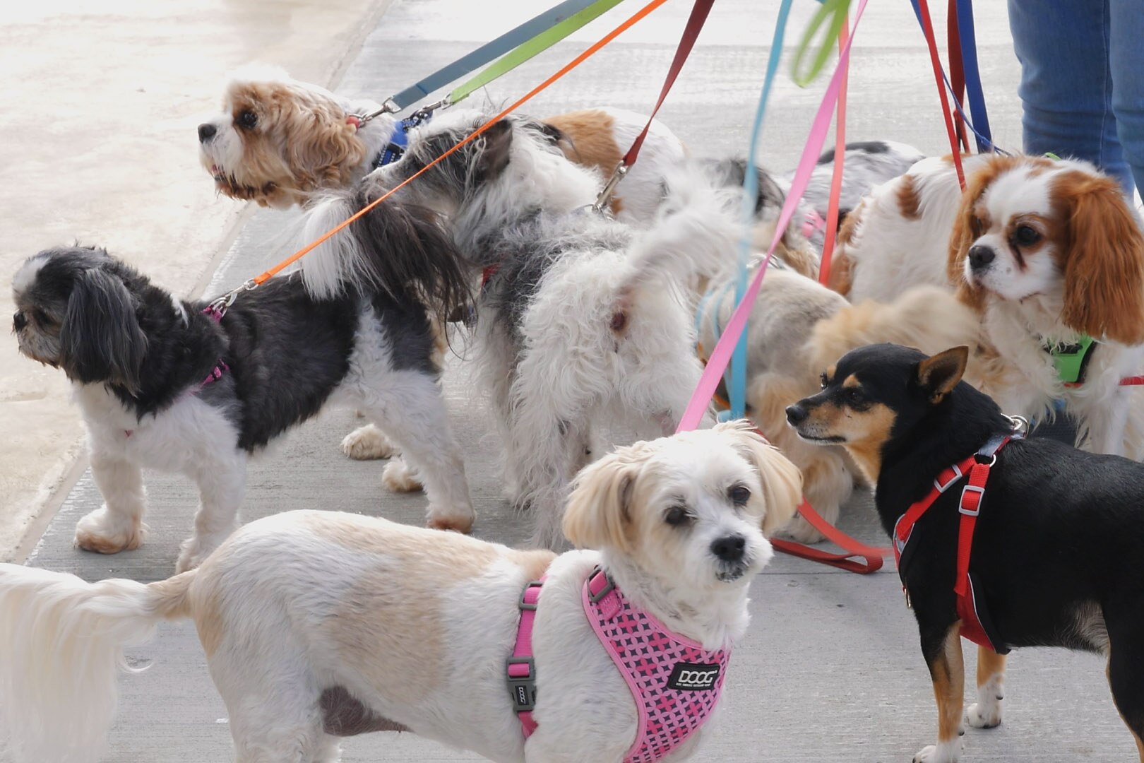 Most days there are nine dogs, sometimes 10 or 11. A network of water bowls comes out and there is very quickly a colourful tangle of leads.