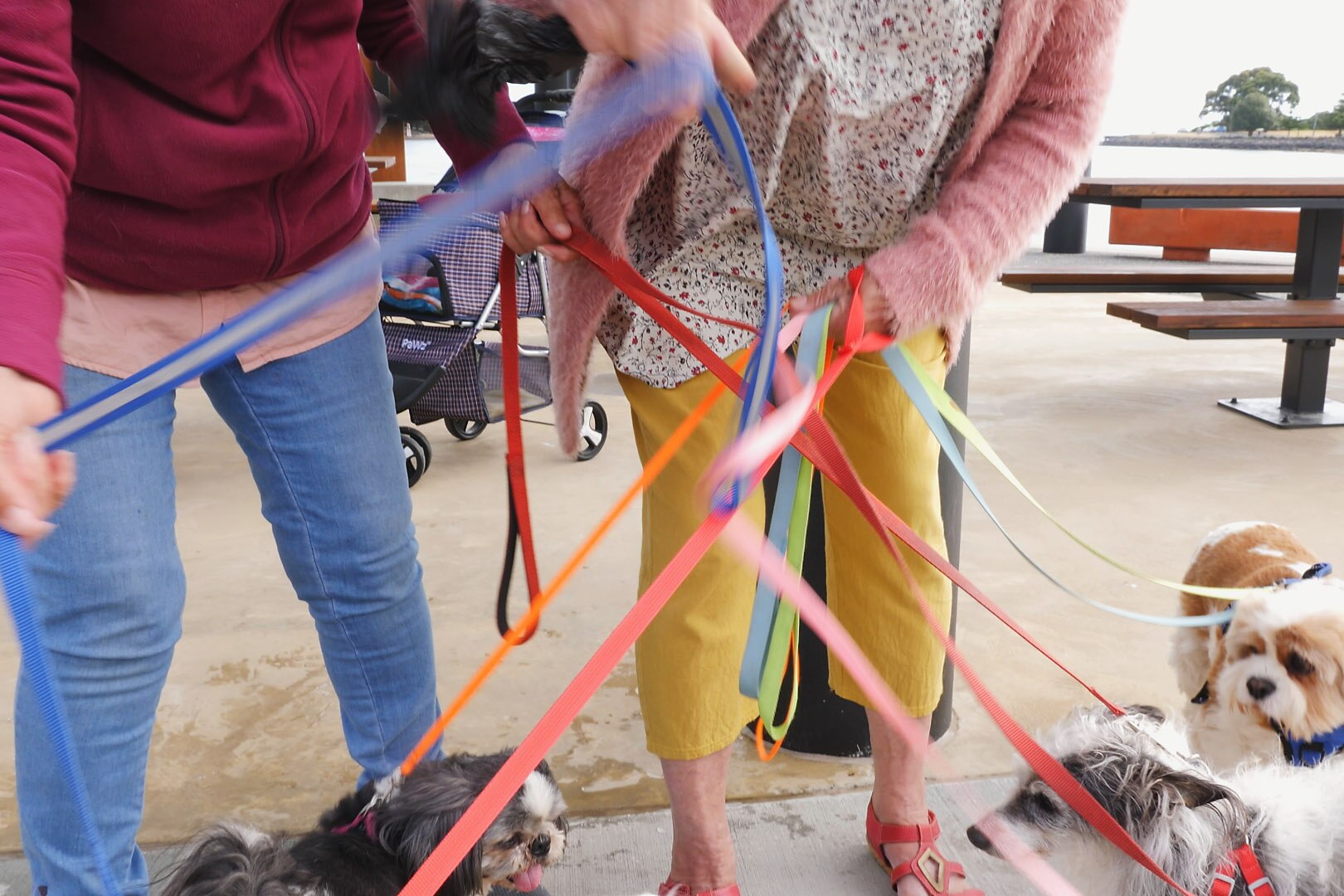 "It's hilarious. We have to think about which dog is on blue, who's on orange, then it's red over blue under pink, around green to untangle," Ms Jordan says.