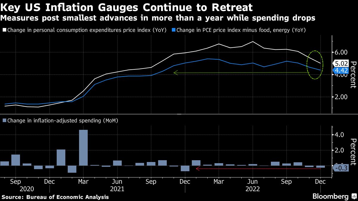 The Fed’s preferred inflation measures eased in December to the slowest annual paces in over a year while consumer spending fell, helping pave the way for officials to further scale back the pace of interest-rate hikes.