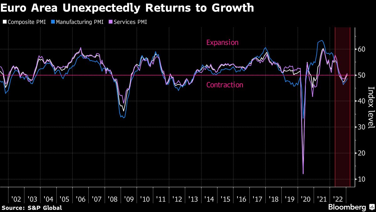 The private-sector economy in the euro area unexpectedly returned to growth at the start of 2023, offering further signs the region may avoid a recession. A variety of factors including slowing inflation, a warmer-than-usual winter in energy-strapped Europe and an easing of supply-chain constraints are fanning optimism in the 20-member currency zone.