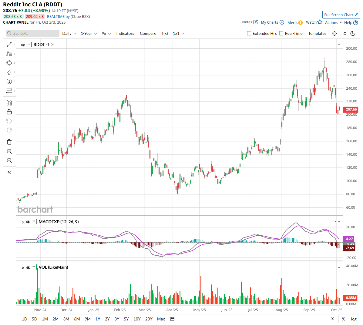 Reddit (RDDT) stock fell by more than 10% on Wednesday after data revealed that ChatGPT's references to the platform have plummeted. The social media company was cited in just 2% of ChatGPT responses on Tuesday, down sharply from an average of 9.7% in August and a peak of over 14% in September. Despite an almost 4% rebound in today's trading, that's still a concerning drop for a stock trading at over 100 times earnings.