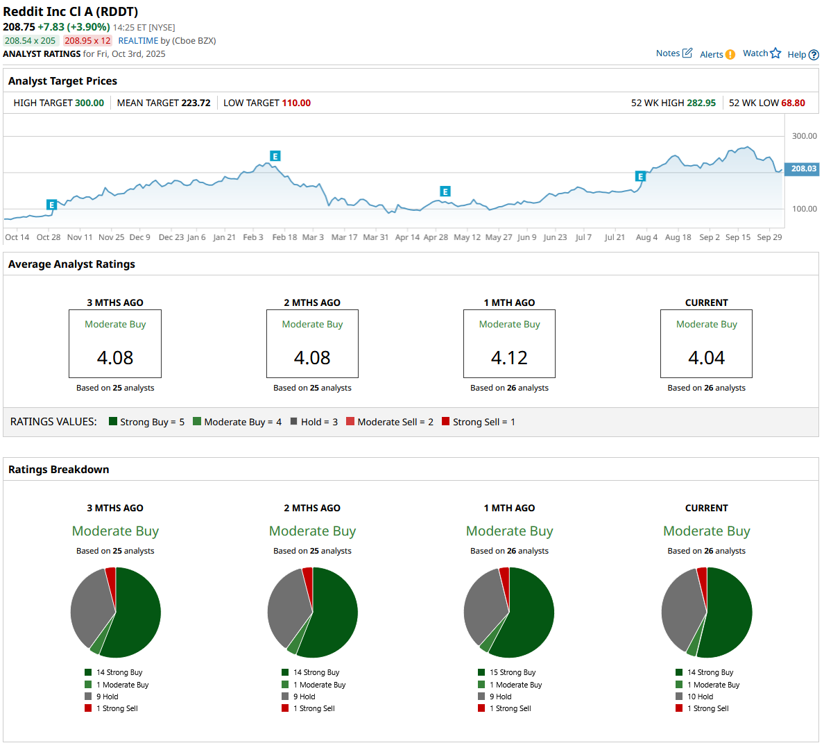Out of the 26 analysts covering RDDT stock, 14 recommend “Strong Buy,” one recommends “Moderate Buy,” 10 recommend “Hold,” and one recommends “Strong Sell.” The average Reddit stock price target is $224, above the current price of $208.