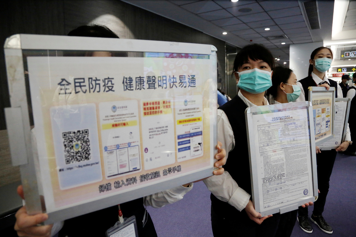 Airport staff hold up information boards regarding passenger health declaration and home quarantine information a mandatory form to fill up once land in Taiwan at Songshan airport in Taipei, Taiwan July 2, 2020. REUTERS/Ann Wang