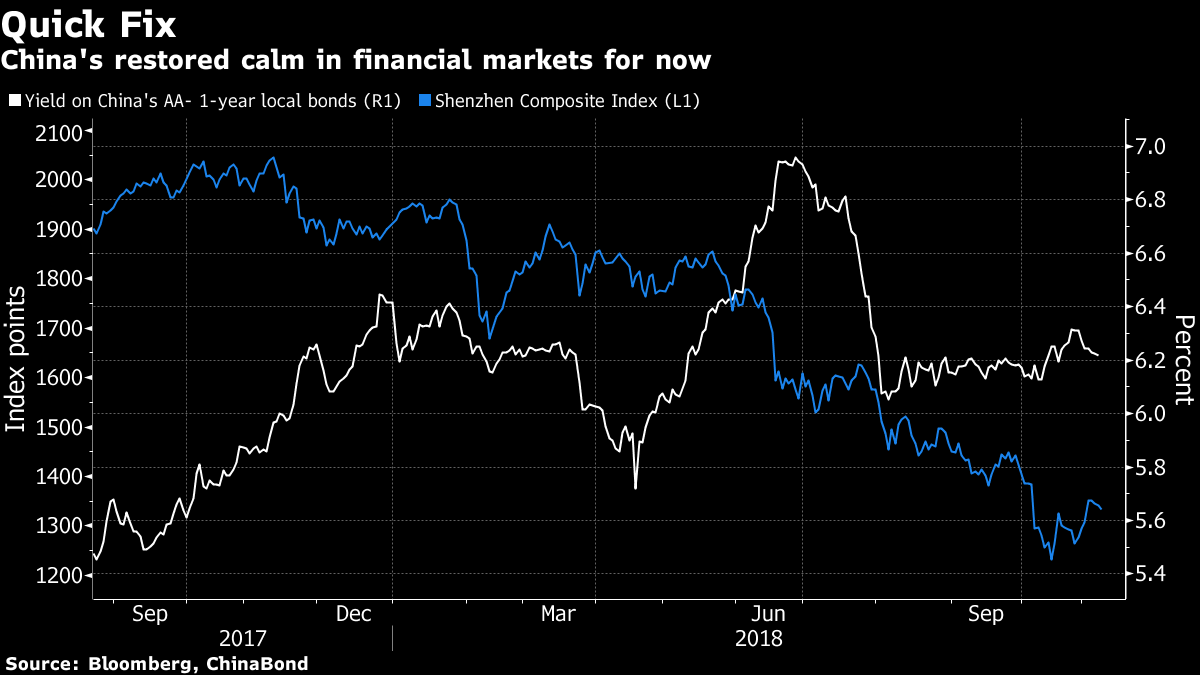 The measures have helped arrest the downward spiral in Chinese shares, though sentiment remains muted. Brokerages, which provide most stock-backed loans, are preparing for losses by beefing up capital buffers. While their shares jumped 23 percent since an almost six-year low in mid-October, they’re still down 30 percent for 2018. Stocks in the tech hub of Shenzhen -- home to many privately-controlled start ups -- are having their worst year-to-date performance since 2008.