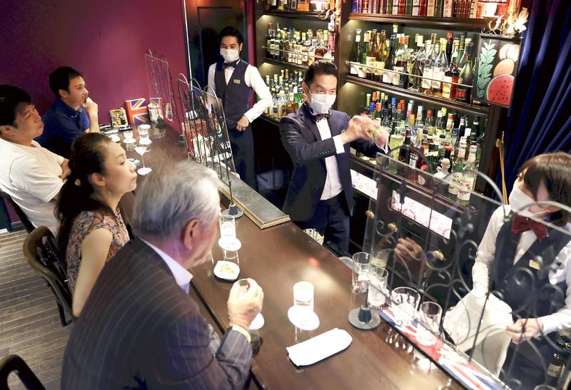 "Cheers!" At "Sherlock," a bar in Ginza, Tokyo, two regular customers and four mask-wearing bartenders celebrated their reunion Friday evening with glasses of champagne.