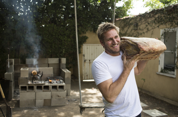 "Primitive elegance is our battle cry," he said. The chef was in the backyard of the house in Beverly Hills that has been Maude's test kitchen and where he, Jermasek and Roderfield, plus a crew of chefs, have been working on curing and aging, cooking and grilling the meats and other products that will go onto the new menu. Stone stood above a wood fire that he'd built on a network of cinder blocks that had been arranged to duplicate the dimensions of Gwen's fire pit. On the blocks: a giant sheet pan, a metal grate stolen from a fireplace, some glowing coals _ and a massive 80-day-aged tomahawk steak. He watched the beef sizzle and flame, holding a pair of tongs in one hand, a blow poke in the other, smiling his trademark wide smile, clearly enjoying the "very Flintstones" moment.