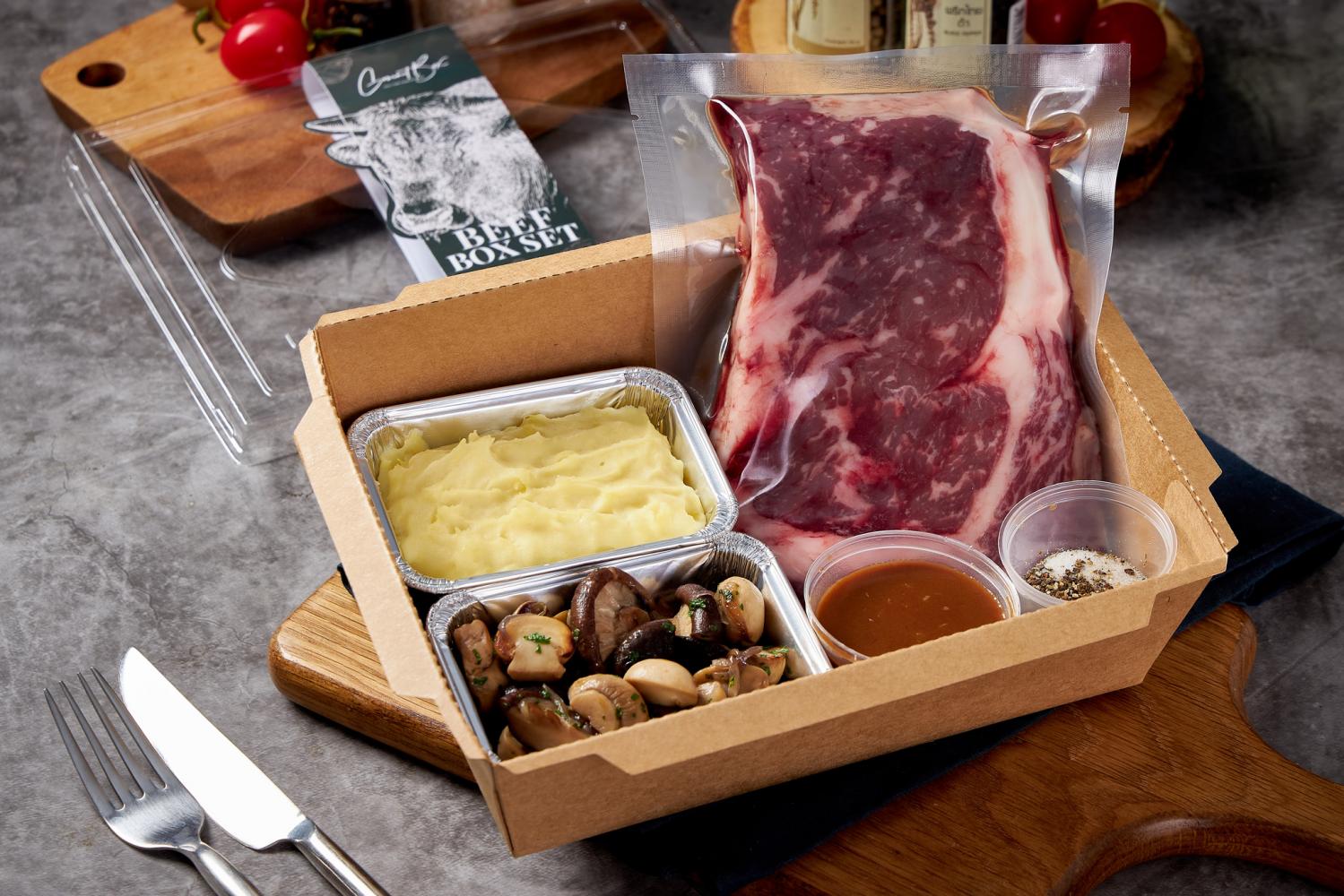 Each steak set is accompanied with red wine sauce and side items of sautéed mushrooms and velvety mashed potatoes. Grilling services are also provided on request.