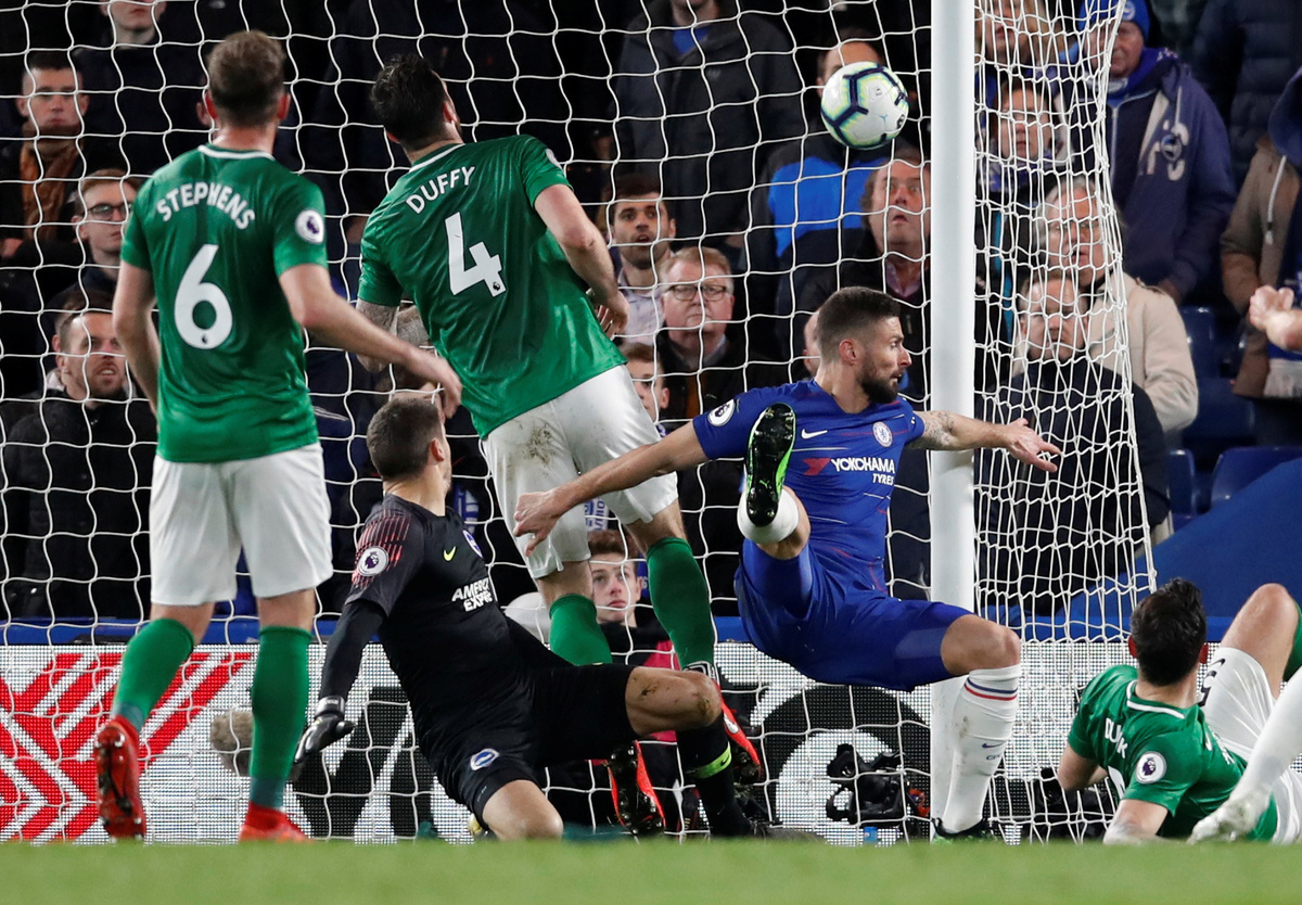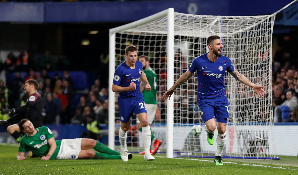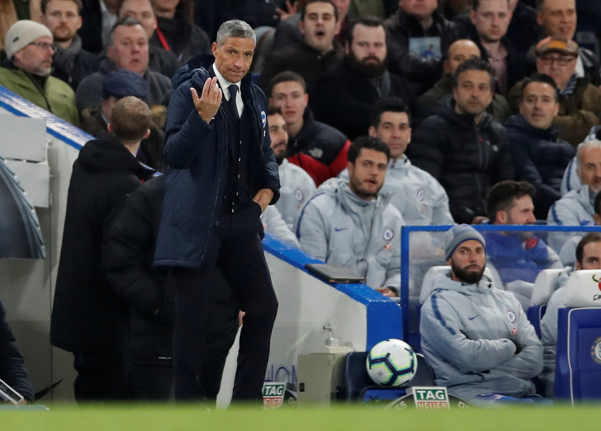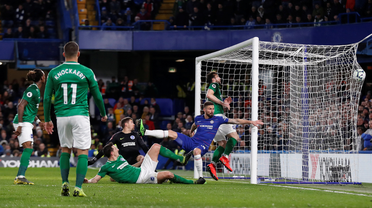 Soccer Football - Premier League - Chelsea v Brighton & Hove Albion - Stamford Bridge, London, Britain - April 3, 2019 Brighton manager Chris Hughton during the match REUTERS/David Klein Soccer Football - Premier League - Chelsea v Brighton & Hove Albion - Stamford Bridge, London, Britain - April 3, 2019 Chelsea's Olivier Giroud scores their first goal Action Images via Reuters/Matthew Childs Soccer Football - Premier League - Chelsea v Brighton & Hove Albion - Stamford Bridge, London, Britain - April 3, 2019 Chelsea's Olivier Giroud scores their first goal REUTERS/David KleinSoccer Football - Premier League - Chelsea v Brighton & Hove Albion - Stamford Bridge, London, Britain - April 3, 2019 Brighton's Shane Duffy picks the ball out of the net after Chelsea's Olivier Giroud scores their first goal Action Images via Reuters/Matthew Childs Soccer Football - Premier League - Chelsea v Brighton & Hove Albion - Stamford Bridge, London, Britain - April 3, 2019 Chelsea's Olivier Giroud celebrates scoring their first goal Action Images via Reuters/Matthew Childs Soccer Football - Premier League - Chelsea v Brighton & Hove Albion - Stamford Bridge, London, Britain - April 3, 2019 Brighton's Gaetan Bong in action with Chelsea's N'Golo Kante Action Images via Reuters/Matthew Childs Soccer Football - Premier League - Chelsea v Brighton & Hove Albion - Stamford Bridge, London, Britain - April 3, 2019 Chelsea manager Maurizio Sarri reacts REUTERS/David Klein Soccer Football - Premier League - Chelsea v Brighton & Hove Albion - Stamford Bridge, London, Britain - April 3, 2019 Chelsea's Callum Hudson-Odoi in action REUTERS/David Klein