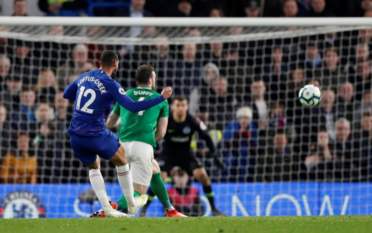 Soccer Football - Premier League - Chelsea v Brighton & Hove Albion - Stamford Bridge, London, Britain - April 3, 2019 Chelsea's Ruben Loftus-Cheek scores their third goal Action Images via Reuters/Matthew Childs