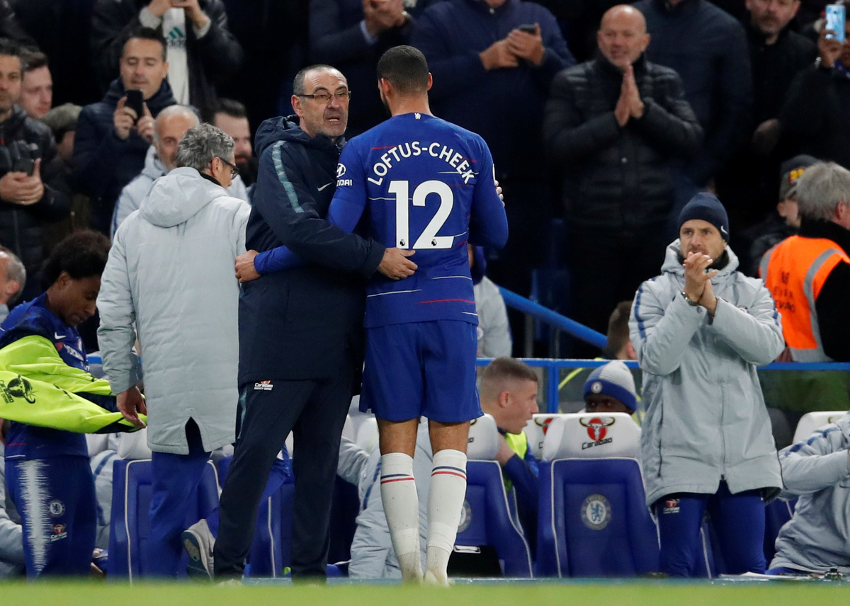 Soccer Football - Premier League - Chelsea v Brighton & Hove Albion - Stamford Bridge, London, Britain - April 3, 2019 Chelsea's Ruben Loftus-Cheek with manager Maurizio Sarri as he leaves the pitch after being substituted REUTERS/David Klein