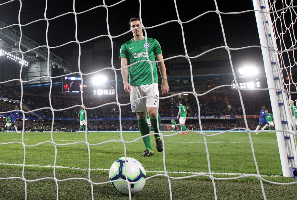 Soccer Football - Premier League - Chelsea v Brighton & Hove Albion - Stamford Bridge, London, Britain - April 3, 2019 Brighton's Lewis Dunk looks dejected after Chelsea's Ruben Loftus-Cheek scores their third goal REUTERS/David Klein
