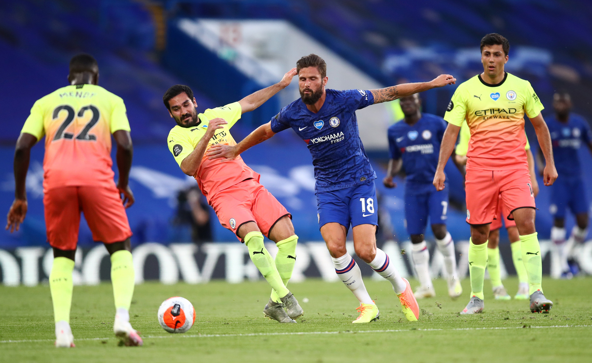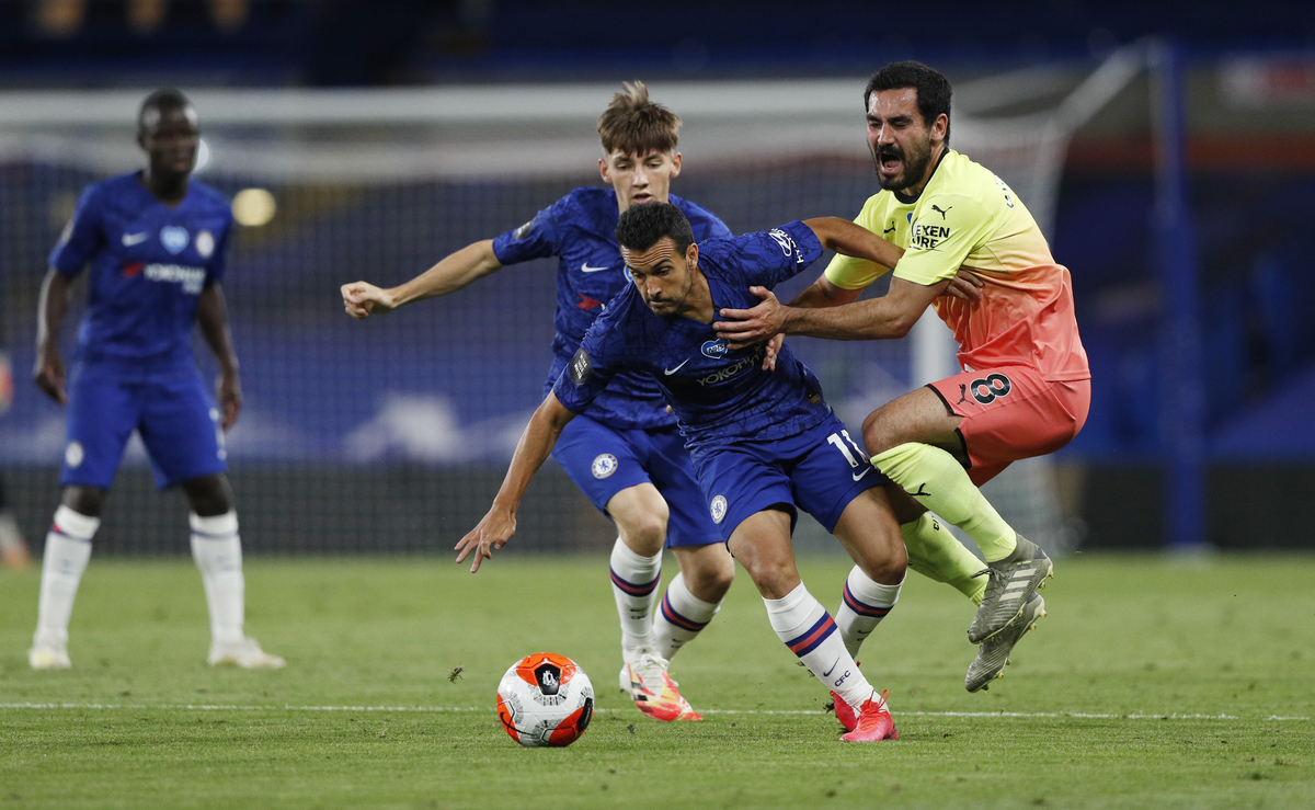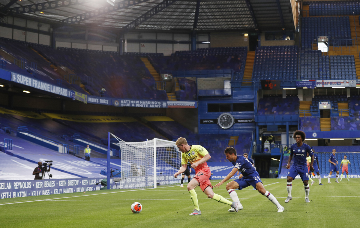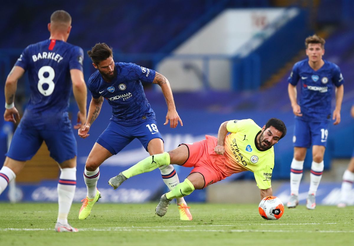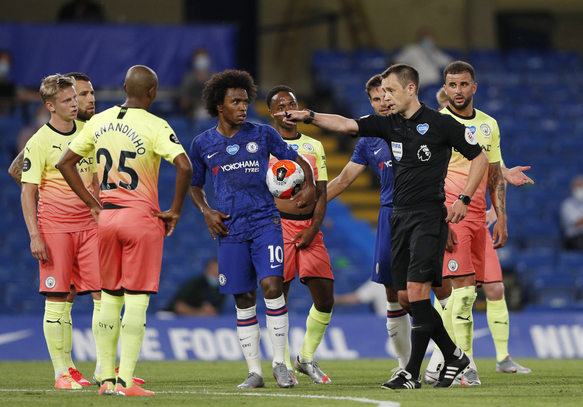 Soccer Football - Premier League - Chelsea v Manchester City - Stamford Bridge, London, Britain - June 25, 2020 Chelsea's Willian celebrates scoring their second goal with teammates, as play resumes behind closed doors following the outbreak of the coronavirus disease (COVID-19) Adrian Dennis/Pool via REUTERS Soccer Football - Premier League - Chelsea v Manchester City - Stamford Bridge, London, Britain - June 25, 2020 Referee Stuart Attwell awards a penalty to Chelsea, as play resumes behind closed doors following the outbreak of the coronavirus disease (COVID-19) Adrian Dennis/Pool via REUTERS Soccer Football - Premier League - Chelsea v Manchester City - Stamford Bridge, London, Britain - June 25, 2020 Chelsea's Olivier Giroud in action with Manchester City's Ilkay Gundogan, as play resumes behind closed doors following the outbreak of the coronavirus disease (COVID-19) Julian Finney/Pool via REUTERS Soccer Football - Premier League - Chelsea v Manchester City - Stamford Bridge, London, Britain - June 25, 2020 Manchester City's Ilkay Gundogan in action with Chelsea's Olivier Giroud, as play resumes behind closed doors following the outbreak of the coronavirus disease (COVID-19) Julian Finney/Pool via REUTERS Soccer Football - Premier League - Chelsea v Manchester City - Stamford Bridge, London, Britain - June 25, 2020 Manchester City's Kevin De Bruyne in action with Chelsea's Cesar Azpilicueta, as play resumes behind closed doors following the outbreak of the coronavirus disease (COVID-19) Adrian Dennis/Pool via REUTERS Soccer Football - Premier League - Chelsea v Manchester City - Stamford Bridge, London, Britain - June 25, 2020 Chelsea's Pedro in action with Manchester City's Ilkay Gundogan, as play resumes behind closed doors following the outbreak of the coronavirus disease (COVID-19) Adrian Dennis/Pool via REUTERS