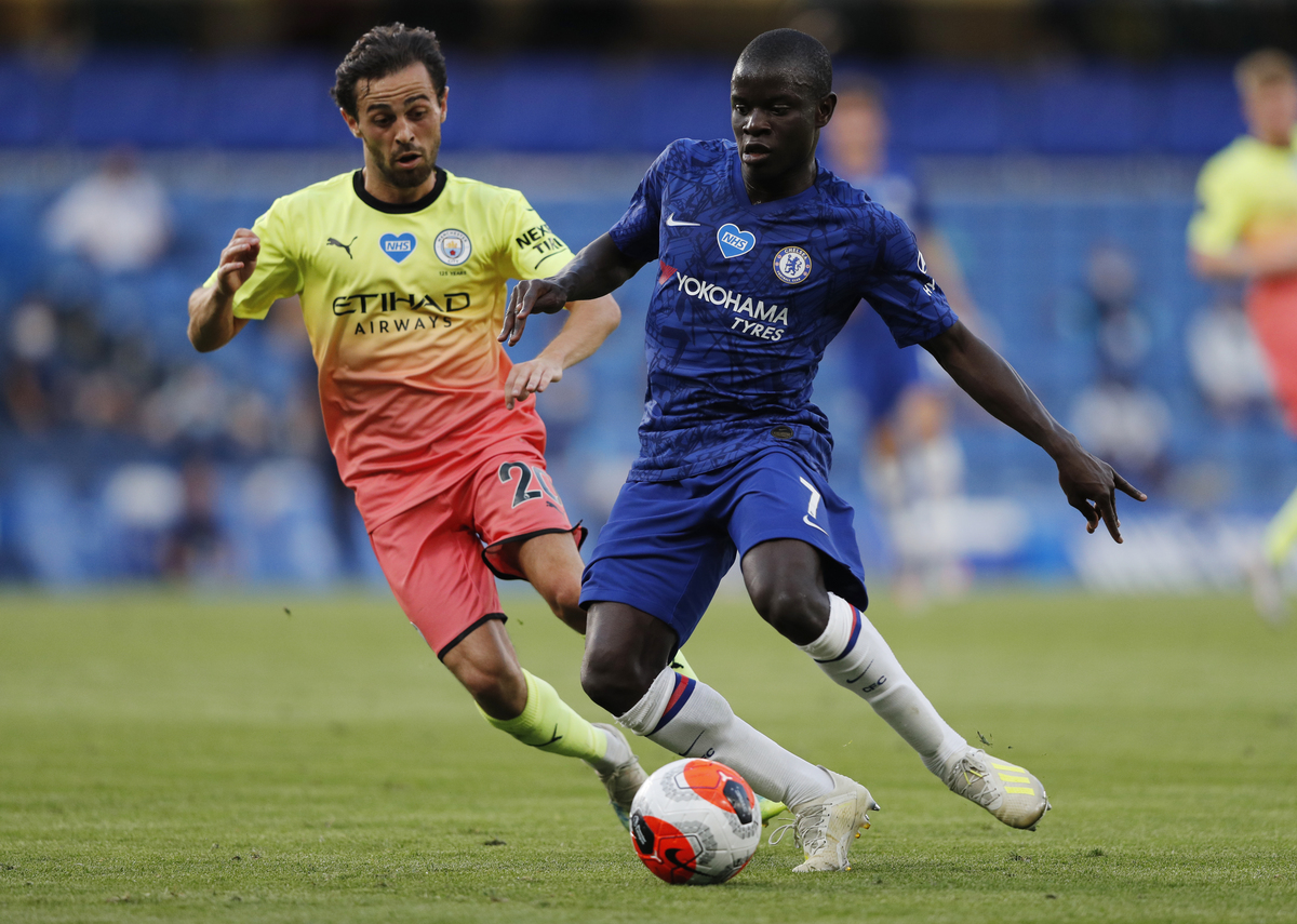 Soccer Football - Premier League - Chelsea v Manchester City - Stamford Bridge, London, Britain - June 25, 2020 Chelsea's N'Golo Kante in action with Manchester City's Bernardo Silva, as play resumes behind closed doors following the outbreak of the coronavirus disease (COVID-19) Adrian Dennis/Pool via REUTERS