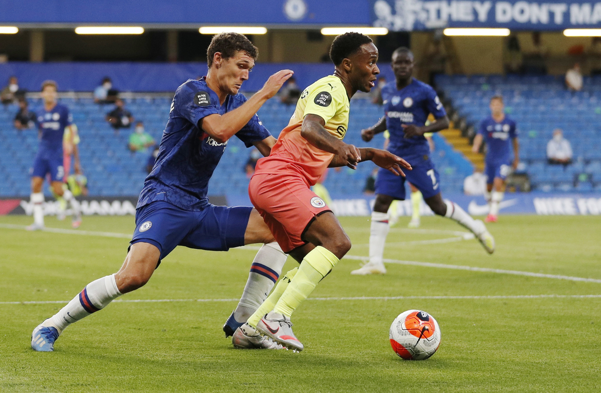 Soccer Football - Premier League - Chelsea v Manchester City - Stamford Bridge, London, Britain - June 25, 2020 Chelsea's Andreas Christensen in action with Manchester City's Raheem Sterling, as play resumes behind closed doors following the outbreak of the coronavirus disease (COVID-19) Adrian Dennis/Pool via REUTERS