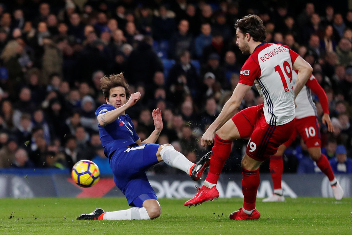 Soccer Football - Premier League - Chelsea vs West Bromwich Albion - Stamford Bridge, London, Britain - February 12, 2018 Chelsea's Cesc Fabregas in action with West Bromwich Albion's Jay Rodriguez REUTERS/Eddie Keogh