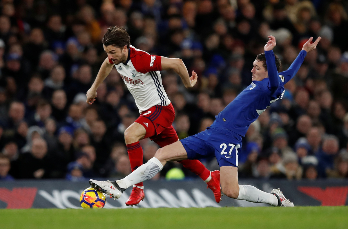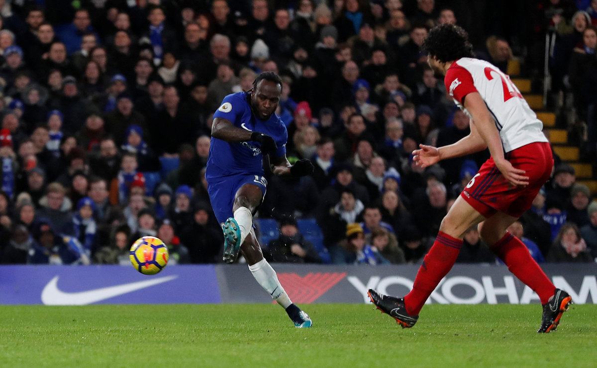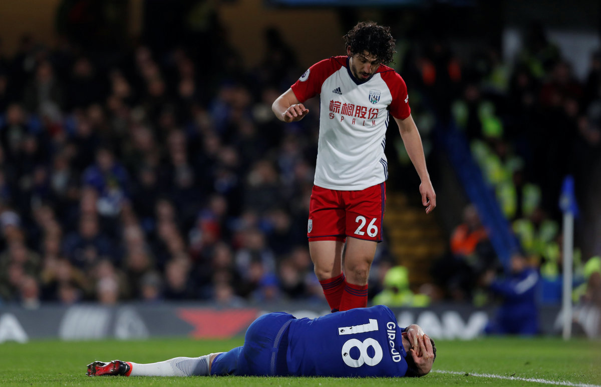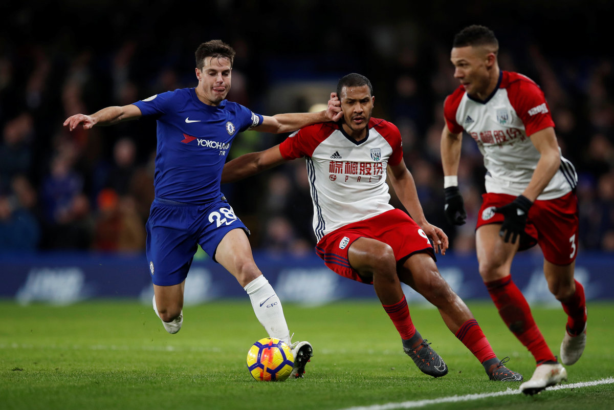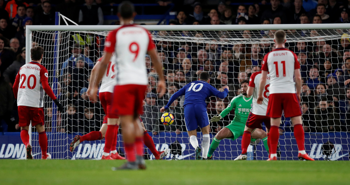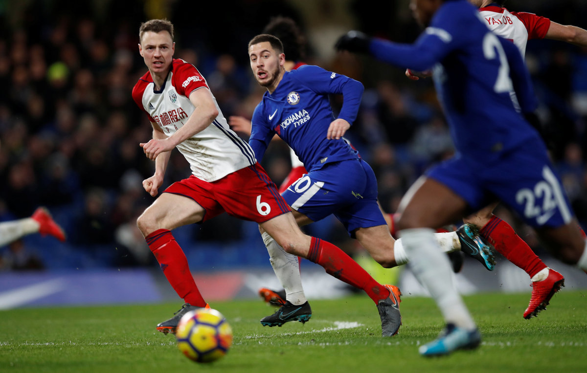 Soccer Football - Premier League - Chelsea vs West Bromwich Albion - Stamford Bridge, London, Britain - February 12, 2018 Chelsea's Andreas Christensen in action with West Bromwich Albion's Jay Rodriguez REUTERS/Eddie KeoghSoccer Football - Premier League - Chelsea vs West Bromwich Albion - Stamford Bridge, London, Britain - February 12, 2018 Chelsea's Thibaut Courtois in action with West Bromwich Albion's Craig Dawson REUTERS/Eddie Keogh Soccer Football - Premier League - Chelsea vs West Bromwich Albion - Stamford Bridge, London, Britain - February 12, 2018 Chelsea's Eden Hazard scores their first goal REUTERS/Eddie KeoghSoccer Football - Premier League - Chelsea vs West Bromwich Albion - Stamford Bridge, London, Britain - February 12, 2018 Chelsea's Eden Hazard celebrates scoring their first goal Action Images via Reuters/Andrew Couldridge Soccer Football - Premier League - Chelsea vs West Bromwich Albion - Stamford Bridge, London, Britain - February 12, 2018 Chelsea's Olivier Giroud reacts after sustaining an injury Action Images via Reuters/Andrew CouldridgeSoccer Football - Premier League - Chelsea vs West Bromwich Albion - Stamford Bridge, London, Britain - February 12, 2018 Chelsea's Olivier Giroud receives medical attention after sustaining an injury Action Images via Reuters/Andrew Couldridge Soccer Football - Premier League - Chelsea vs West Bromwich Albion - Stamford Bridge, London, Britain - February 12, 2018 Chelsea's Cesar Azpilicueta in action with West Bromwich Albion's Salomon Rondon and Kieran Gibbs REUTERS/Eddie Keogh Soccer Football - Premier League - Chelsea vs West Bromwich Albion - Stamford Bridge, London, Britain - February 12, 2018 Chelsea's Victor Moses scores their second goal REUTERS/Eddie Keogh Soccer Football - Premier League - Chelsea vs West Bromwich Albion - Stamford Bridge, London, Britain - February 12, 2018 Chelsea's Eden Hazard in action with West Bromwich Albion's Jonny Evans REUTERS/Eddie Keogh Soccer Football - Premier League - Chelsea vs West Bromwich Albion - Stamford Bridge, London, Britain - February 12, 2018 Chelsea's Victor Moses scores their second goal REUTERS/Eddie Keogh Soccer Football - Premier League - Chelsea vs West Bromwich Albion - Stamford Bridge, London, Britain - February 12, 2018 Chelsea's Eden Hazard celebrates scoring their third goal with Alvaro Morata REUTERS/Eddie Keogh