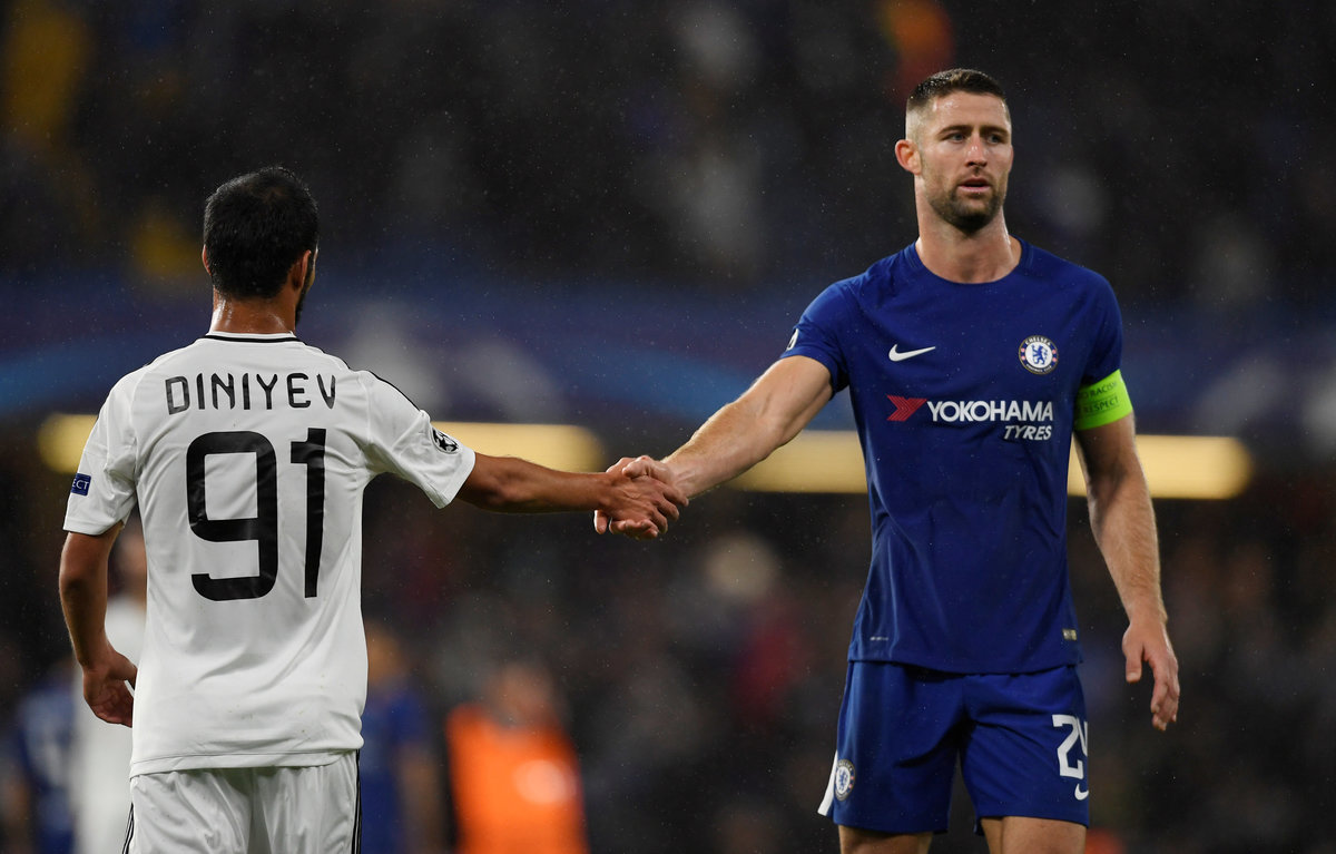 Soccer Football - Champions League - Chelsea vs Qarabag FK - Stamford Bridge, London, Britain - September 12, 2017 Chelsea's Gary Cahill shakes hands Qarabag’s Joshgun Diniyev at the end of the match Action Images via Reuters/Tony O'Brien