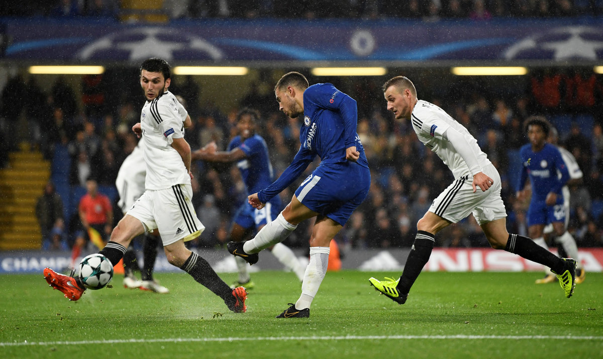 Soccer Football - Champions League - Chelsea vs Qarabag FK - Stamford Bridge, London, Britain - September 12, 2017 Chelsea's Eden Hazard has a shot at goal Action Images via Reuters/Tony O'Brien