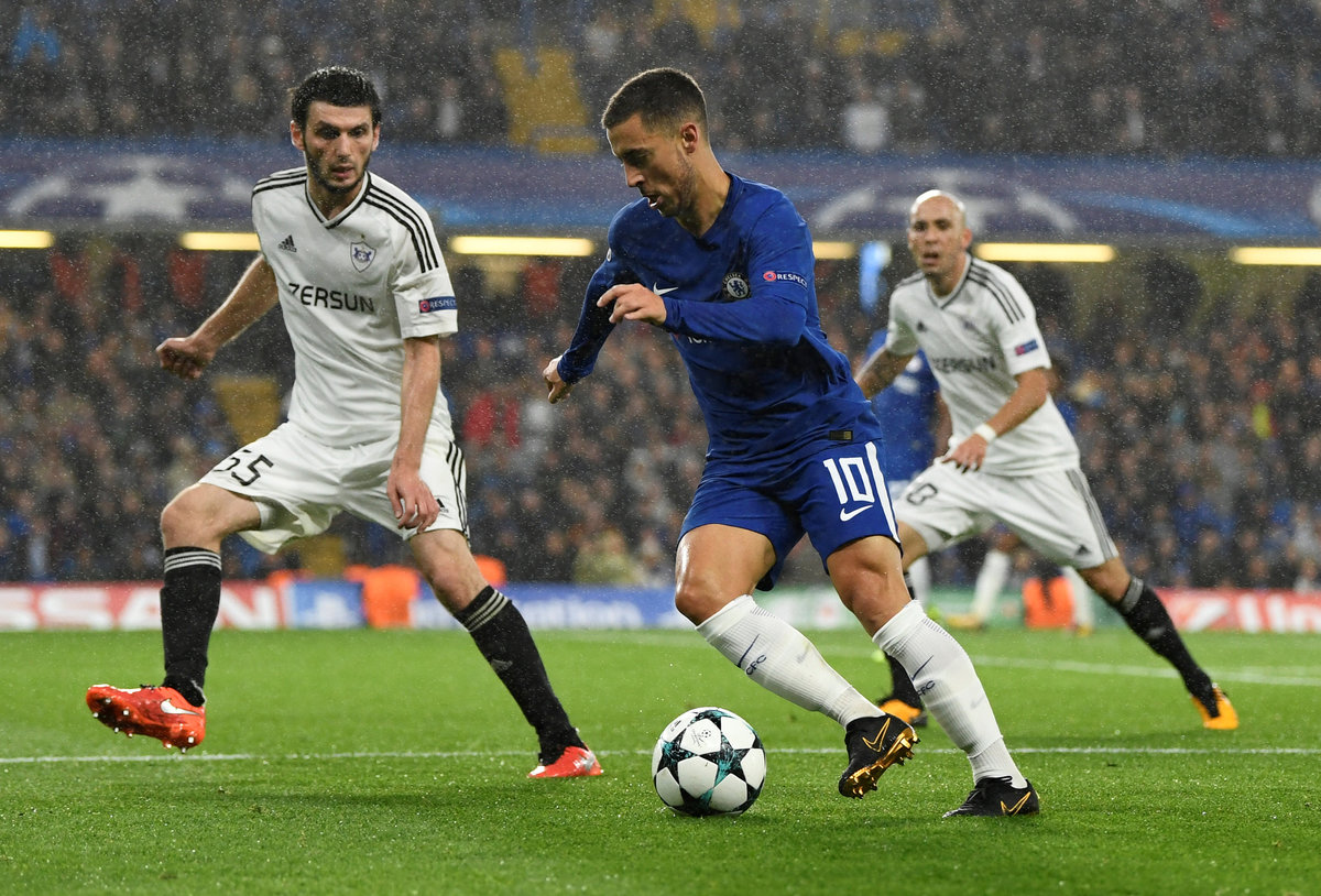 Soccer Football - Champions League - Chelsea vs Qarabag FK - Stamford Bridge, London, Britain - September 12, 2017 Chelsea's Eden Hazard in action with Qarabag’s Badavi Huseynov Action Images via Reuters/Tony O'Brien