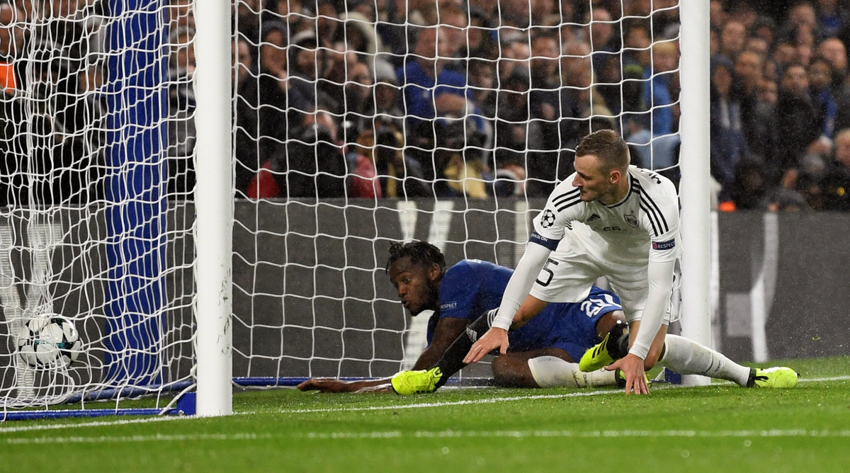 Soccer Football - Champions League - Chelsea vs Qarabag FK - Stamford Bridge, London, Britain - September 12, 2017 Chelsea's Michy Batshuayi in action with Qarabag’s Maksim Medvedev who scores an own goal for the sixth goal REUTERS/Dylan Martinez