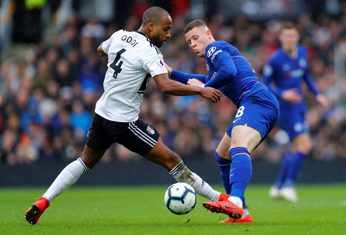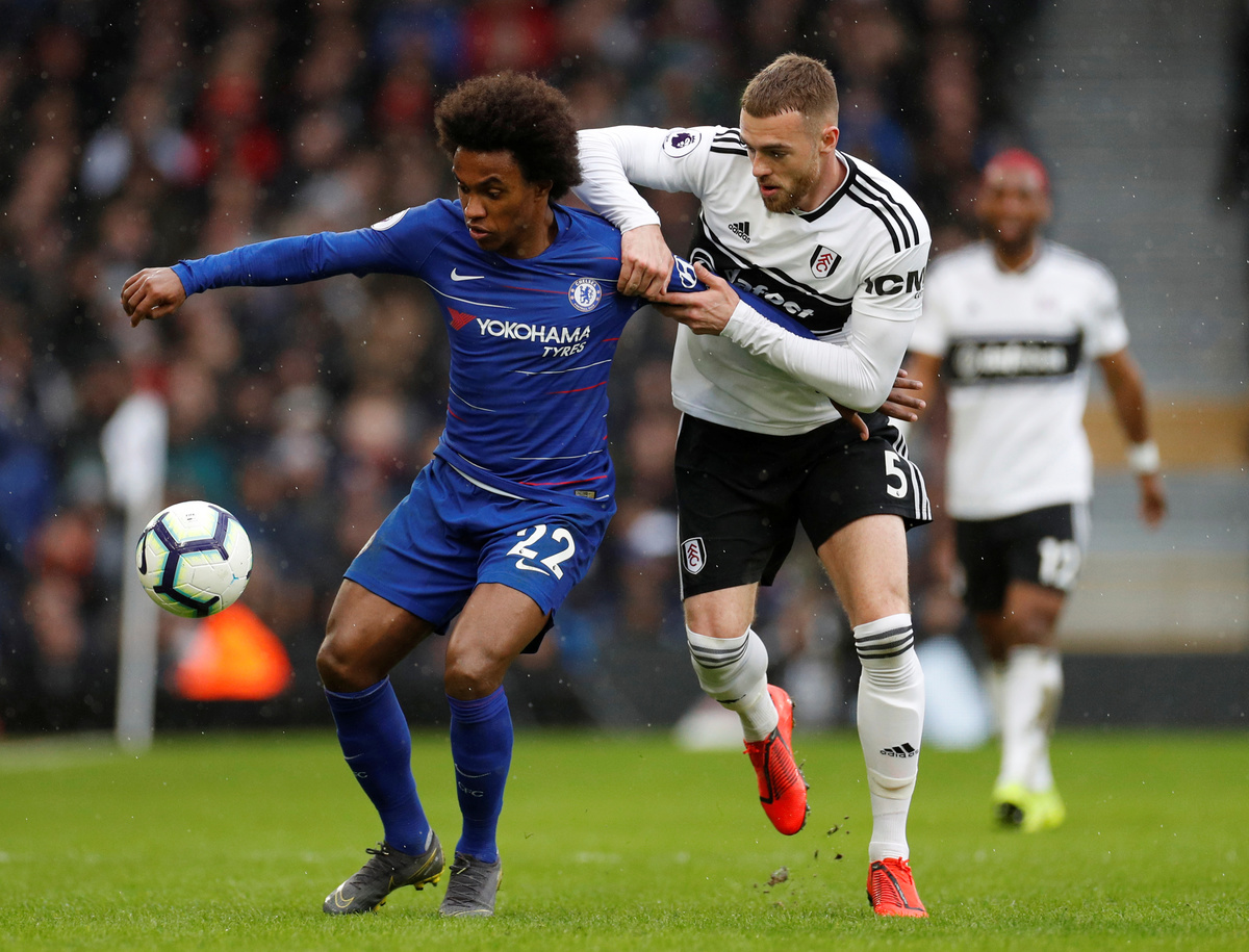 Soccer Football - Premier League - Fulham v Chelsea - Craven Cottage, London, Britain - March 3, 2019 Chelsea's Jorginho scores their second goal REUTERS/Eddie KeoghSoccer Football - Premier League - Fulham v Chelsea - Craven Cottage, London, Britain - March 3, 2019 Fulham's Ryan Sessegnon in action with Chelsea's Jorginho and Andreas Christensen Soccer Football - Premier League - Fulham v Chelsea - Craven Cottage, London, Britain - March 3, 2019 Chelsea's Willian in action with Fulham's Ryan Babel Action Images via Reuters/John Sibley Soccer Football - Premier League - Fulham v Chelsea - Craven Cottage, London, Britain - March 3, 2019 Chelsea's Willian in action with Fulham's Calum Chambers Action Images via Reuters/John SibleySoccer Football - Premier League - Fulham v Chelsea - Craven Cottage, London, Britain - March 3, 2019 Fulham's Tim Ream in action with Chelsea's N'Golo Kante Action Images via Reuters/John Sibley Soccer Football - Premier League - Fulham v Chelsea - Craven Cottage, London, Britain - March 3, 2019 Chelsea's Cesar Azpilicueta reacts Action Images via Reuters/John Sibley Soccer Football - Premier League - Fulham v Chelsea - Craven Cottage, London, Britain - March 3, 2019 Chelsea's Ross Barkley in action with Fulham's Denis Odoi REUTERS/Eddie Keogh