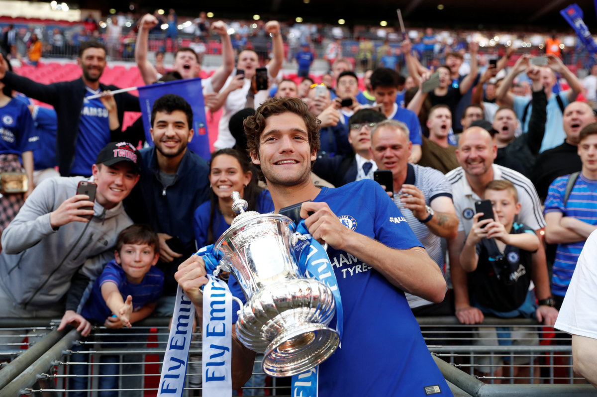 Soccer Football - FA Cup Final - Chelsea vs Manchester United - Wembley Stadium, London, Britain - May 19, 2018 Chelsea's Marcos Alonso celebrates winning the FA Cup with the trophy and fans Action Images via Reuters/Lee Smith