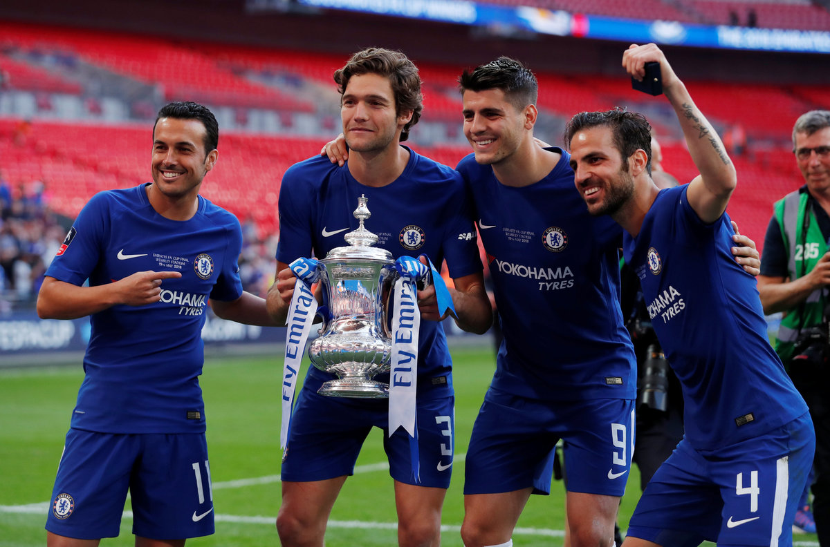 Soccer Football - FA Cup Final - Chelsea vs Manchester United - Wembley Stadium, London, Britain - May 19, 2018 Chelsea's Pedro, Marcos Alonso, Alvaro Morata and Cesc Fabregas celebrate winning the final with the trophy Action Images via Reuters/Andrew Couldridge