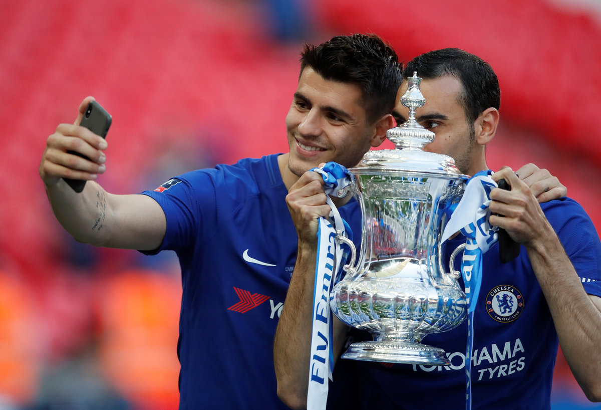 Soccer Football - FA Cup Final - Chelsea vs Manchester United - Wembley Stadium, London, Britain - May 19, 2018 Chelsea's Alvaro Morata and Davide Zappacosta take a selfie as they celebrate winning the final with the trophy REUTERS/David Klein