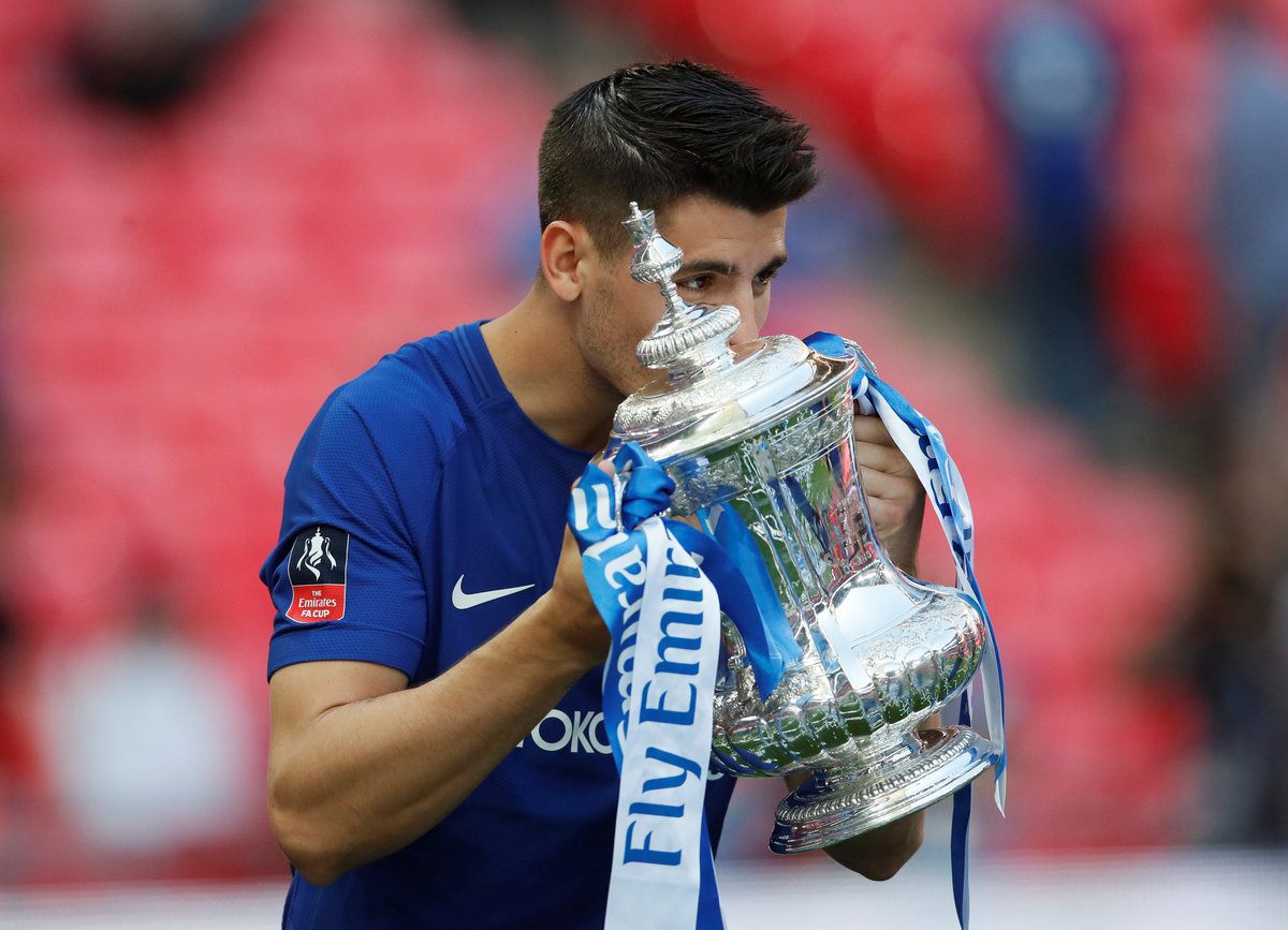 Soccer Football - FA Cup Final - Chelsea vs Manchester United - Wembley Stadium, London, Britain - May 19, 2018 Chelsea's Alvaro Morata celebrates winning the final with the trophy REUTERS/David Klein