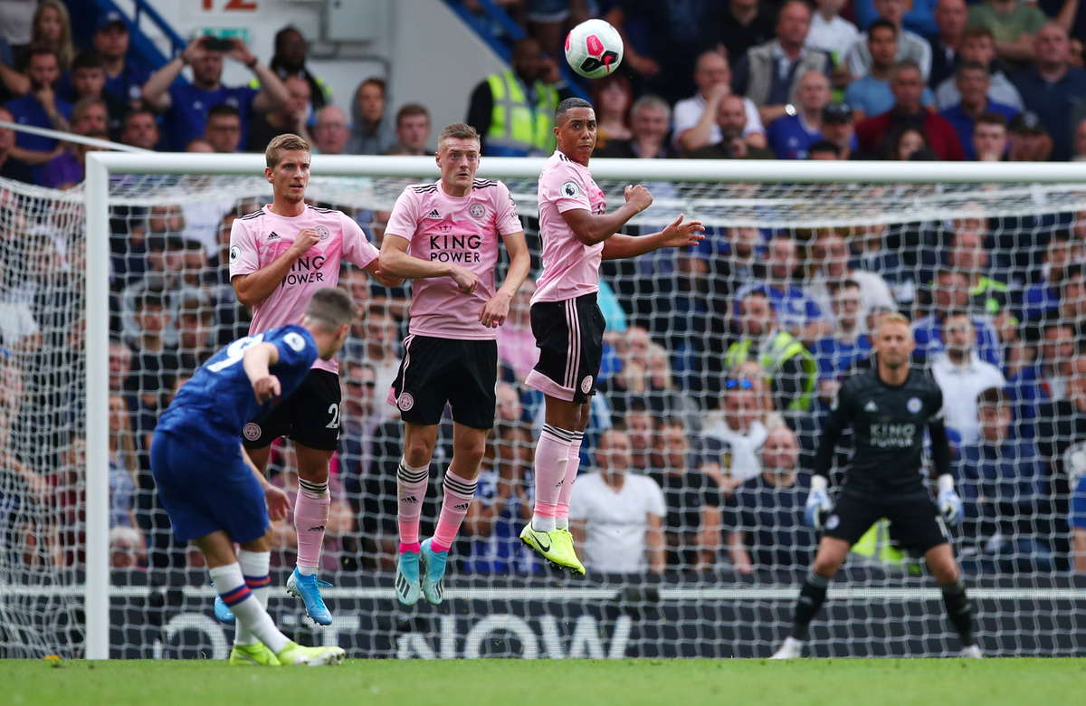 Soccer Football - Premier League - Chelsea v Leicester City - Stamford Bridge, London, Britain - August 18, 2019 Leicester City's Dennis Praet, Jamie Vardy and Youri Tielemans attempt to block a free kick from Chelsea's Mason Mount REUTERS/Eddie Keogh Soccer Football - Premier League - Chelsea v Leicester City - Stamford Bridge, London, Britain - August 18, 2019 Leicester City's Christian Fuchs in action with Chelsea's Cesar Azpilicueta REUTERS/Eddie Keogh