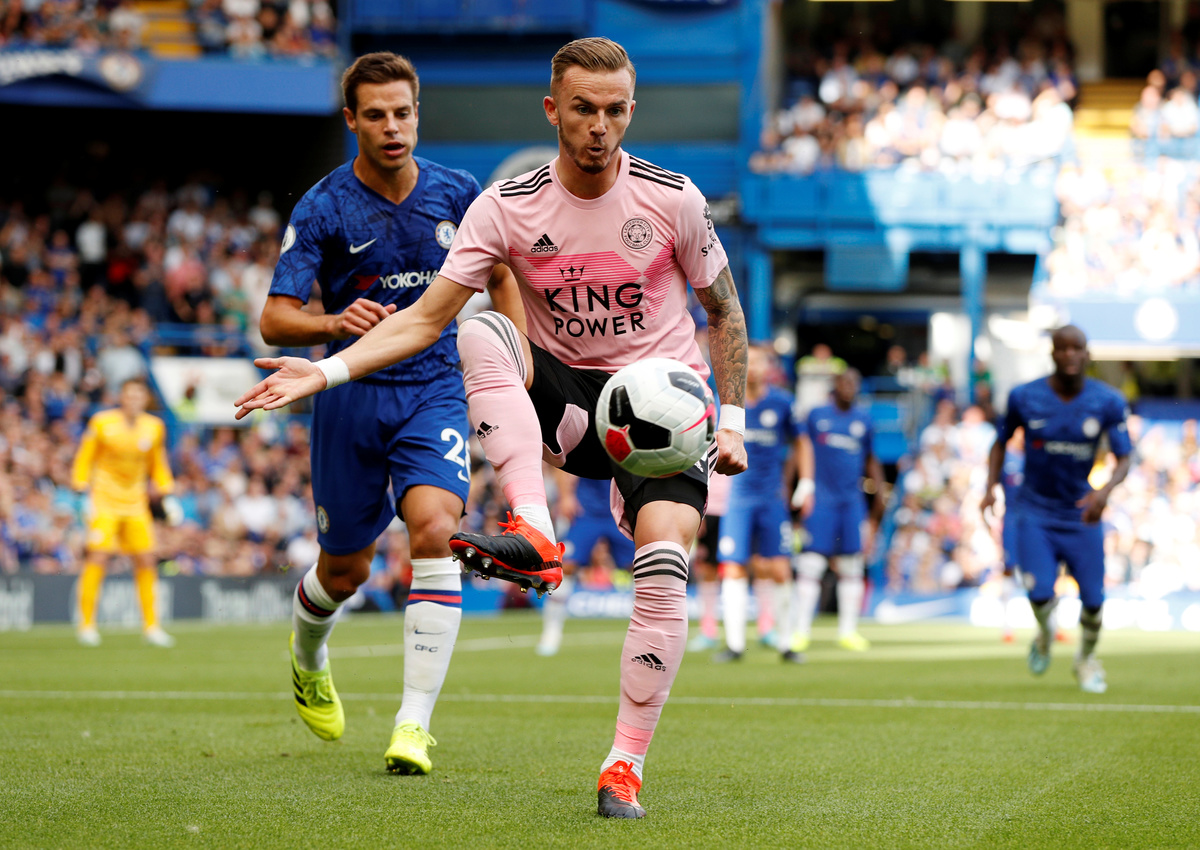 Soccer Football - Premier League - Chelsea v Leicester City - Stamford Bridge, London, Britain - August 18, 2019 Leicester City's James Maddison in action with Chelsea's Cesar Azpilicueta Action Images via Reuters/John Sibley