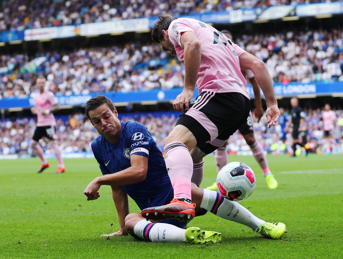 Soccer Football - Premier League - Chelsea v Leicester City - Stamford Bridge, London, Britain - August 18, 2019 Leicester City's Christian Fuchs in action with Chelsea's Cesar Azpilicueta REUTERS/Eddie Keogh