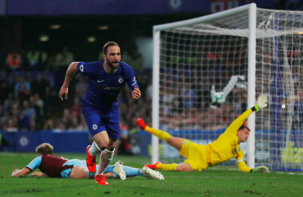 Chelsea hit back with two goals in two minutes. First, winger Eden Hazard bamboozled Burnley's defence before cutting the ball back for Kante to sweep home. Then Higuain blasted a shot in off the underside of the crossbar in the 14th minute.