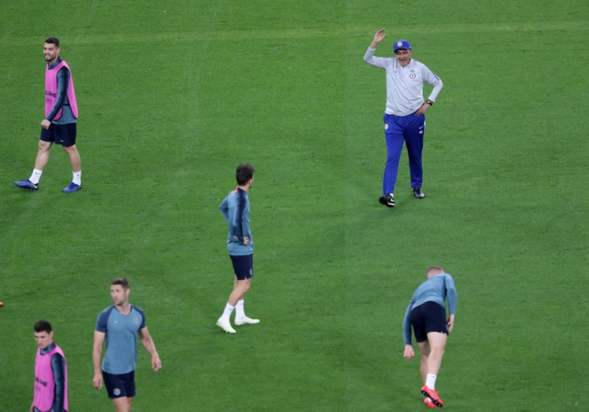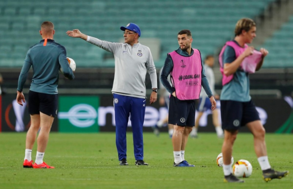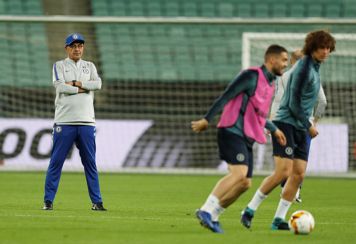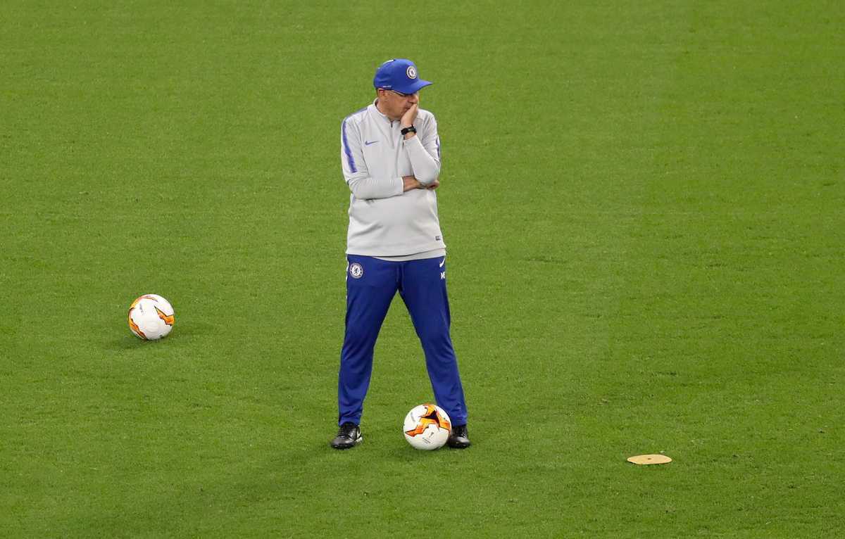BAKU (Reuters) - Chelsea coach Maurizio Sarri, whose future at Stamford Bridge is in question, stomped away from a training session before Wednesday's Europa League final, visibly angry as he threw his hat to the ground and kicked it.
