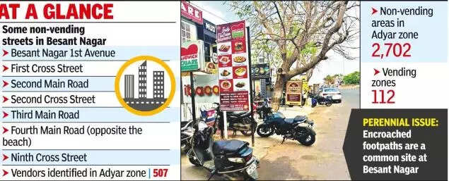 CHENNAI: The visitors to Besant Nagar, home to the famous Elliot’s beach, keep growing, but encroachments on the avenues have completely taken over the footpaths, forcing for pedestrians on to the road.