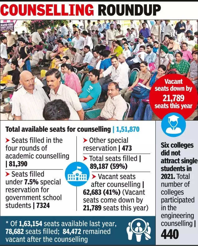 CHENNAI: After five years of downward trend, engineering colleges witnessed a good admission season this year. After four rounds of online counseling, 89,187 seats (59%) have been filled, which is 13% more compared to the previous year. The number of vacant seats also came down by more than 21,000 to 62,683.