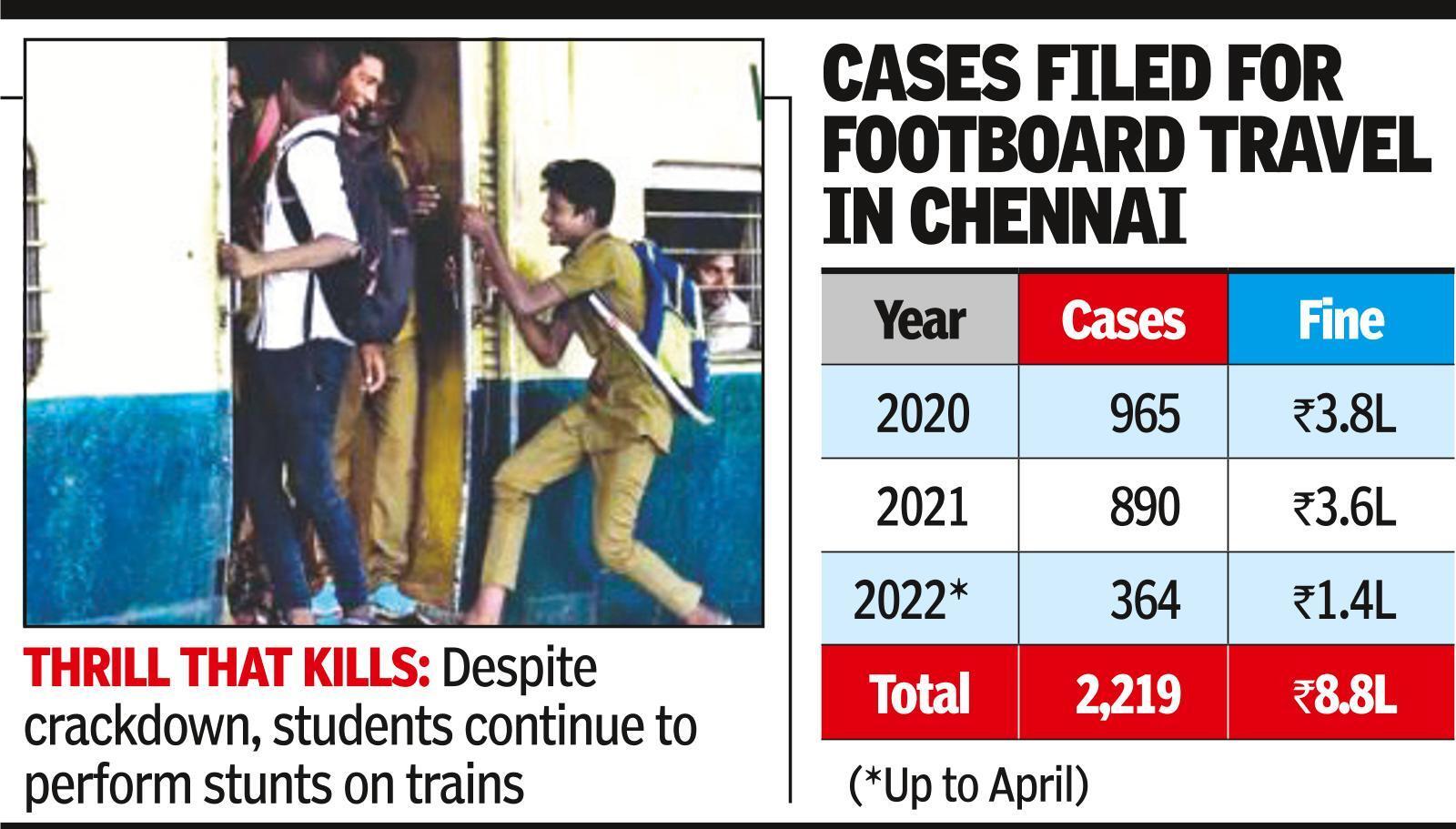 Railways had stepped up booking cases and has already booked 364 cases up to April and has collected a fine of ₹1.4lakh for footboard travelling in Chennai division. Last year, 890 cases were booked. But charging cases and collecting fines does not seem to work as students continue to do acrobatics on moving trains when there is no RPF presence on the station.