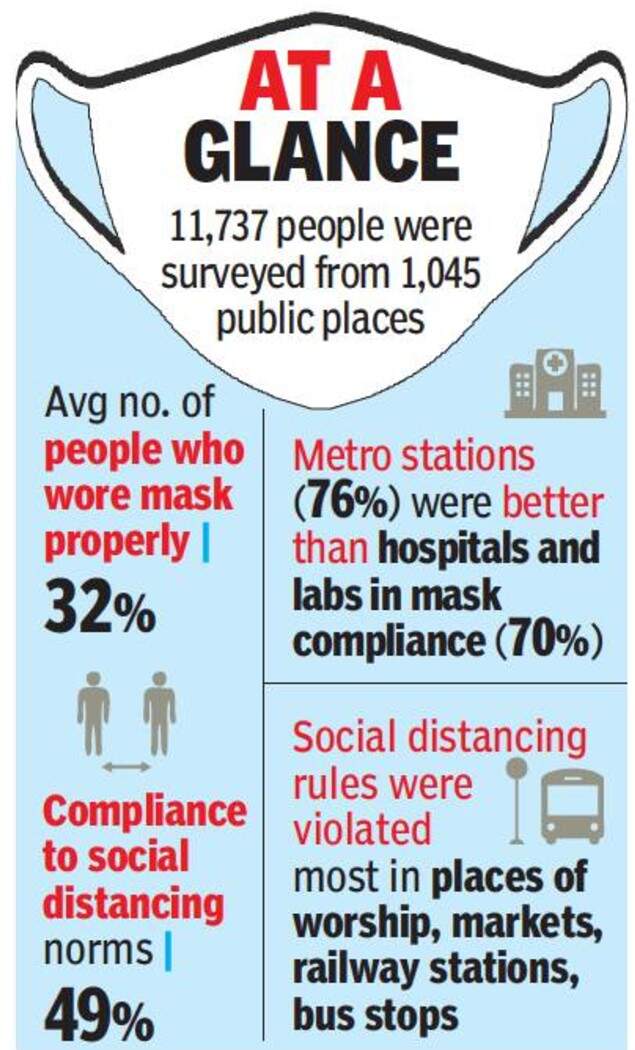 The yet-to-be published survey was conducted between July 23 and 31 among 11,737 people in 1,045 public places including malls, hotels, markets, places of worship, bus stops and railway stations. Preliminary analysis showed that an average of 38% of people wear masks and social distancing norms are followed in less than 50% of public places. “There are huge differences in people’s behaviour at different places,” she said.