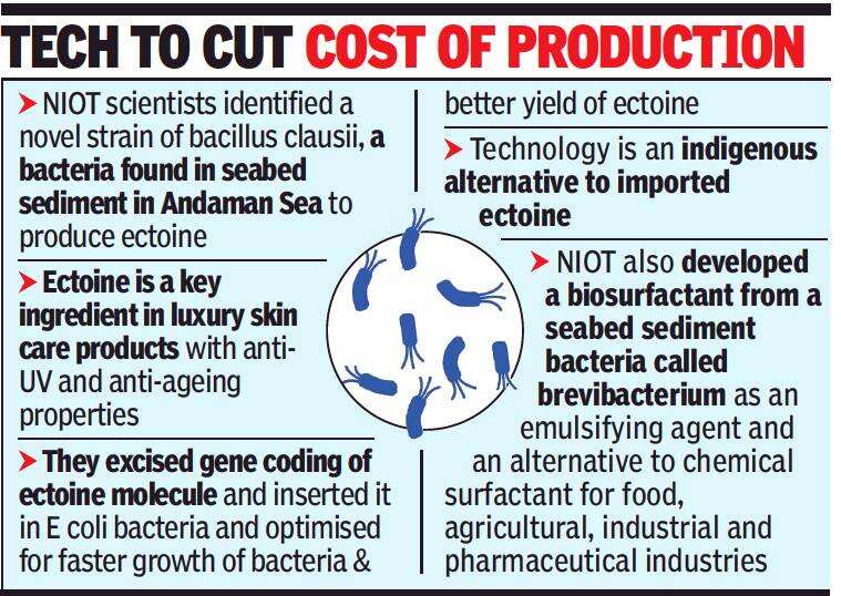 CHENNAI: City scientists have developed a key ingredient, which has UV protection and anti-ageing properties, for luxury cosmetic and skin care products from a novel strain of bacteria found on the seabed sediment in the Andaman Sea.