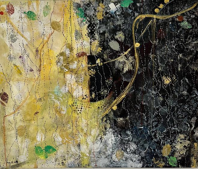 Another painting, Sunlight, showcases Thejomaye’s artistic vision. Inspired by the words “Light blinding white and stark, characteristically crystal clear,” she portrays both light and darkness, two sides of the same coin. “There is life in sunlight,” she explains, incorporating leaves within the light.