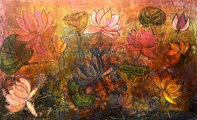 One captivating piece, Lotus, depicts the poem’s words: “Blossoming in muddied mired waters, long stalked buds opening to the first rays of the sun, at dawn.” Jyothi’s evocative language is brought to life through Thejomaye’s brushstrokes showing lotuses in water and a ray of warm sunlight upon them.