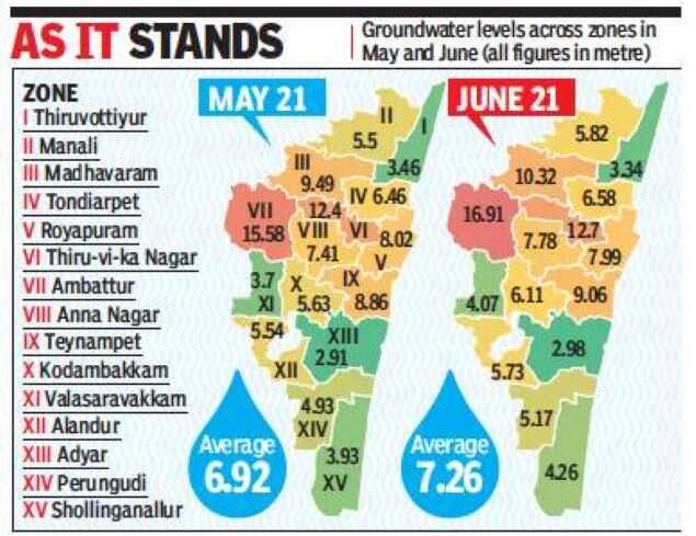 With the exception of Tiruvottiyur and Royapuram, all other zones recorded a drop. Madhavaram reported the maximum drop of about 0.83m in June.